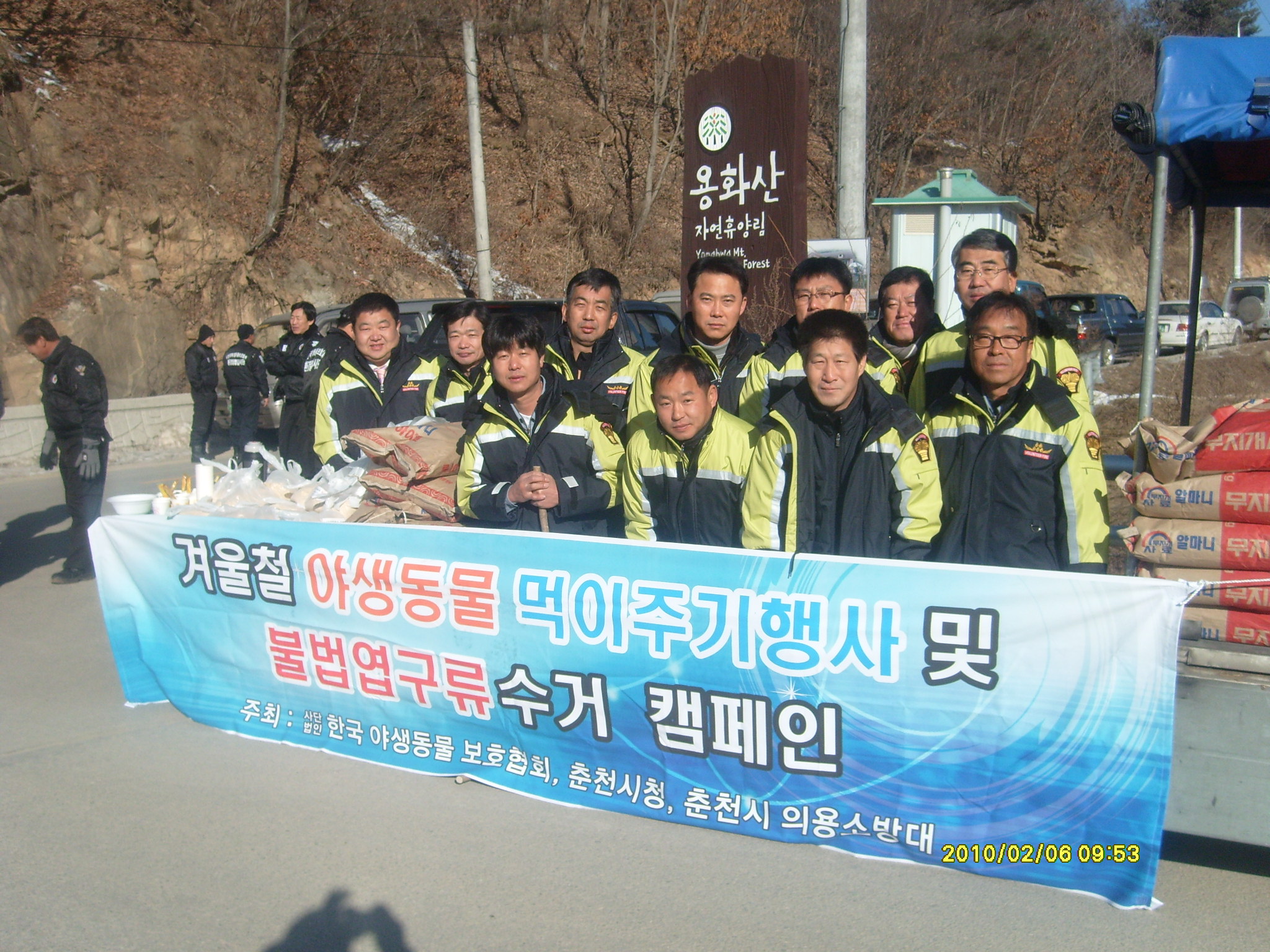 춘천의용소방대(대장 이돈균)에서는 2월 6일 9시부터 용화산 입구에서 동물보호협회 회원과 같이 야생동물 먹이주기 행사를 실시하였습니다. 이날 대원 20여명이 참석하여 등산객에게 먹이를 나누어주고 산에 먹이를 주었습니다.