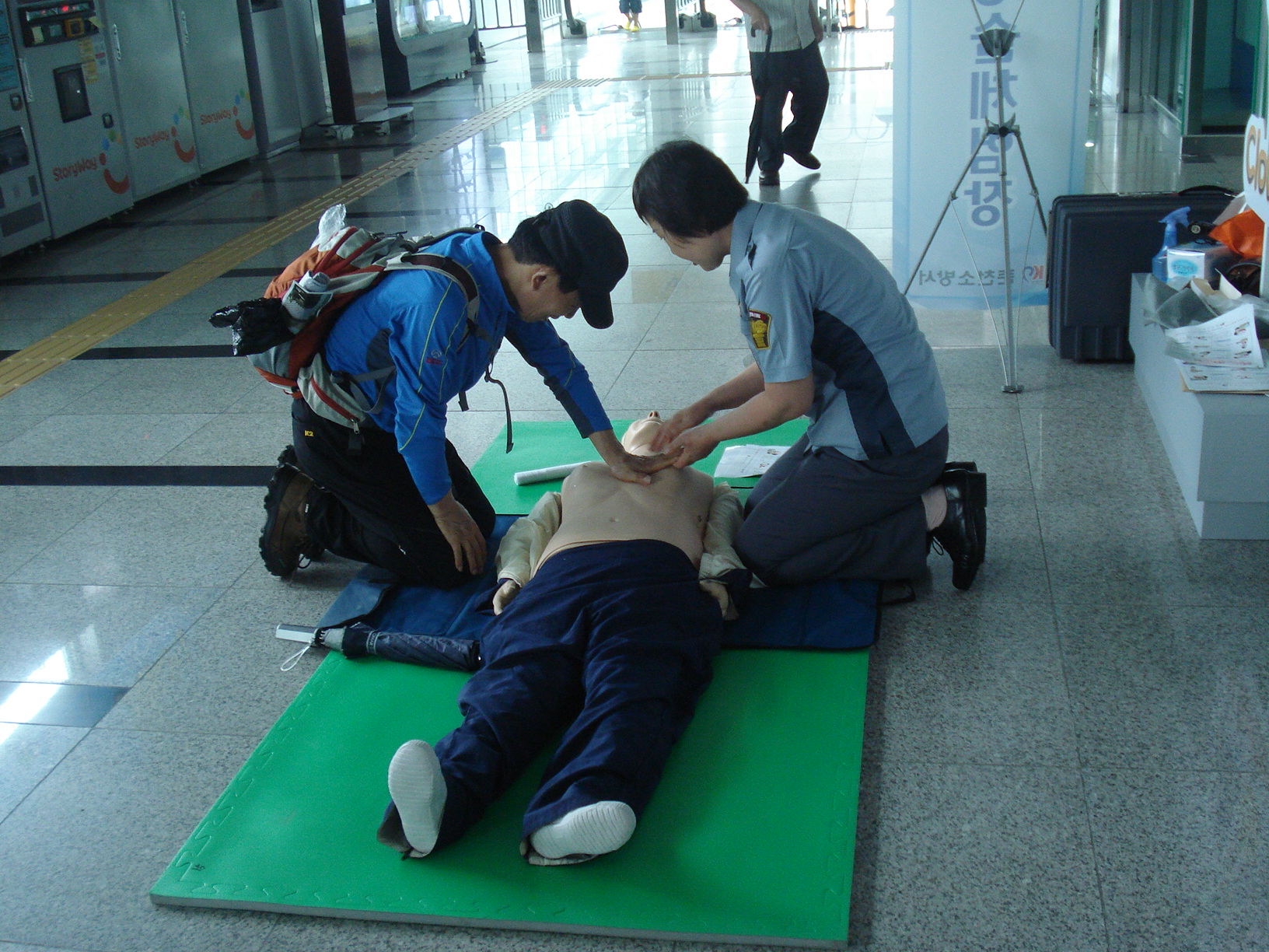 휴가철 춘천을 찾는 사람들에게 119에서 춘천역 안에 준비한 심폐소생술 체험을 하고 있습니다 춘천시여성의용소방대원이 2인1조로 매일2~3시간 봉사하고 있습니다 더운날씨에 고생 많으십니다