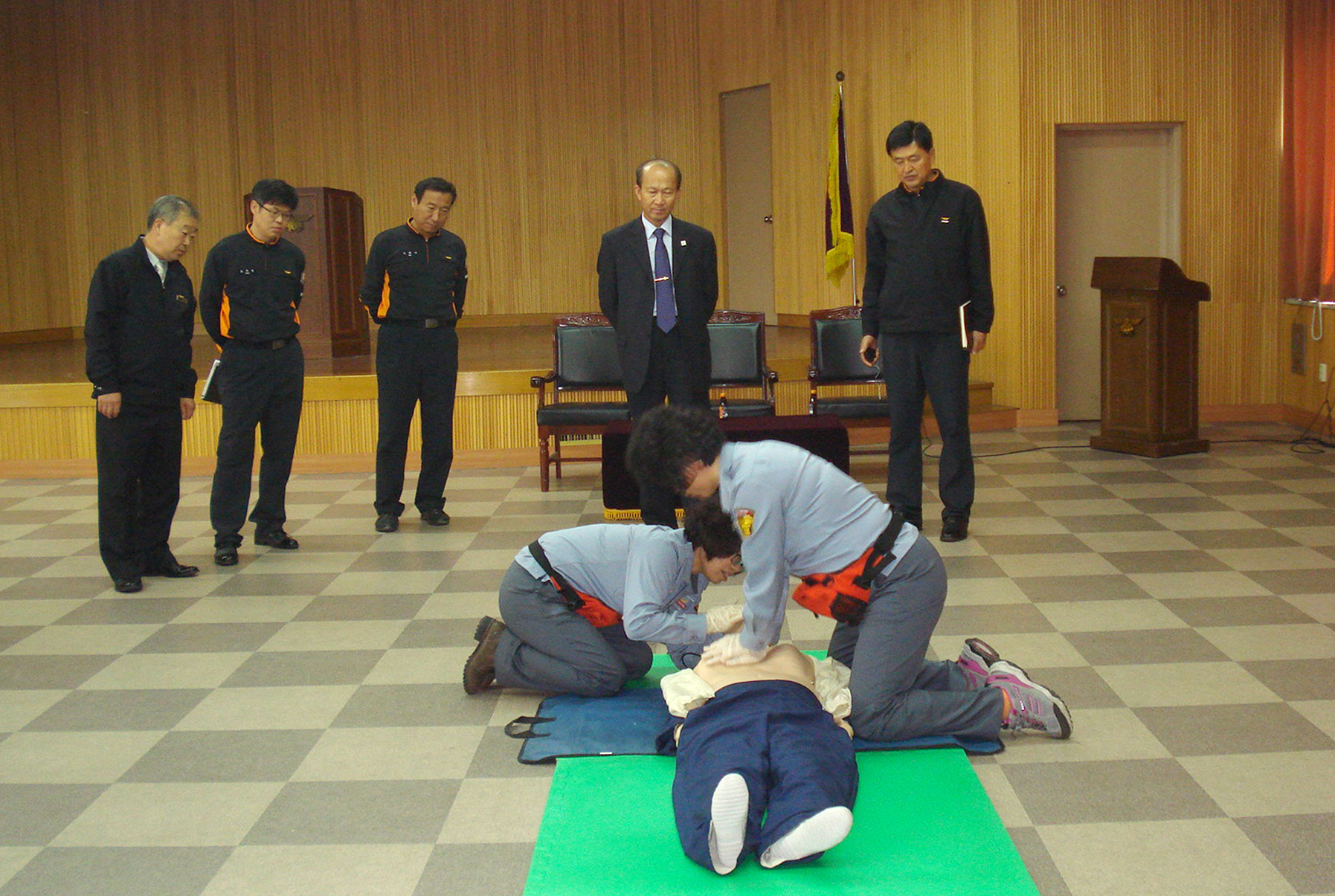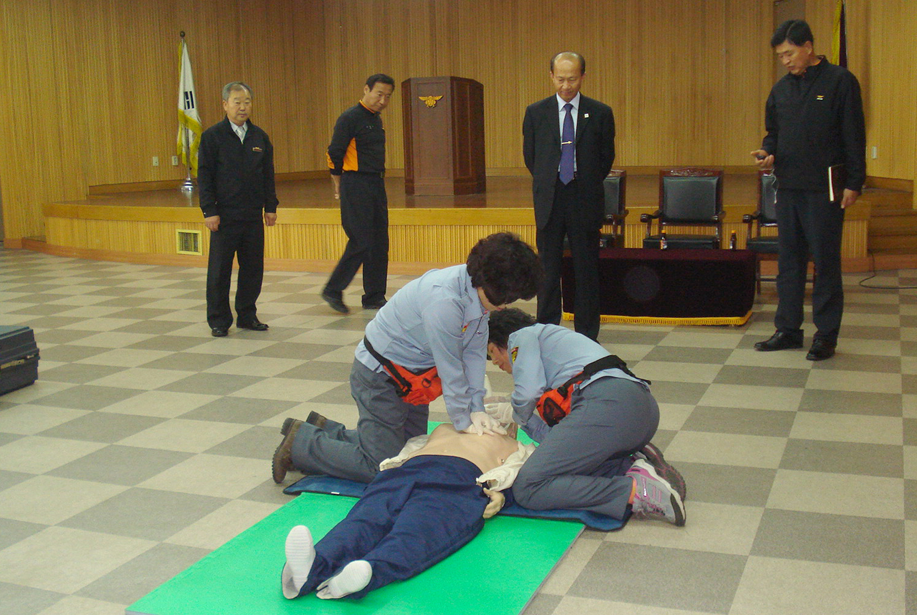 10월11일 응급처치 경연대회을 위해 서장님 앞에서 시범보이고 있는 연화언니,성옥이 언니
