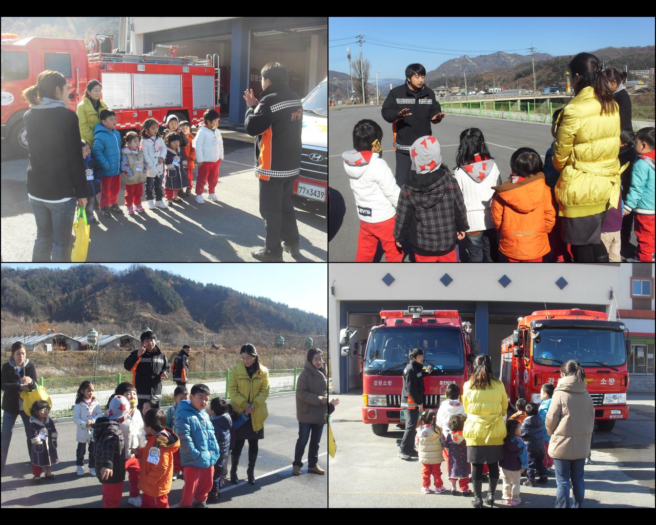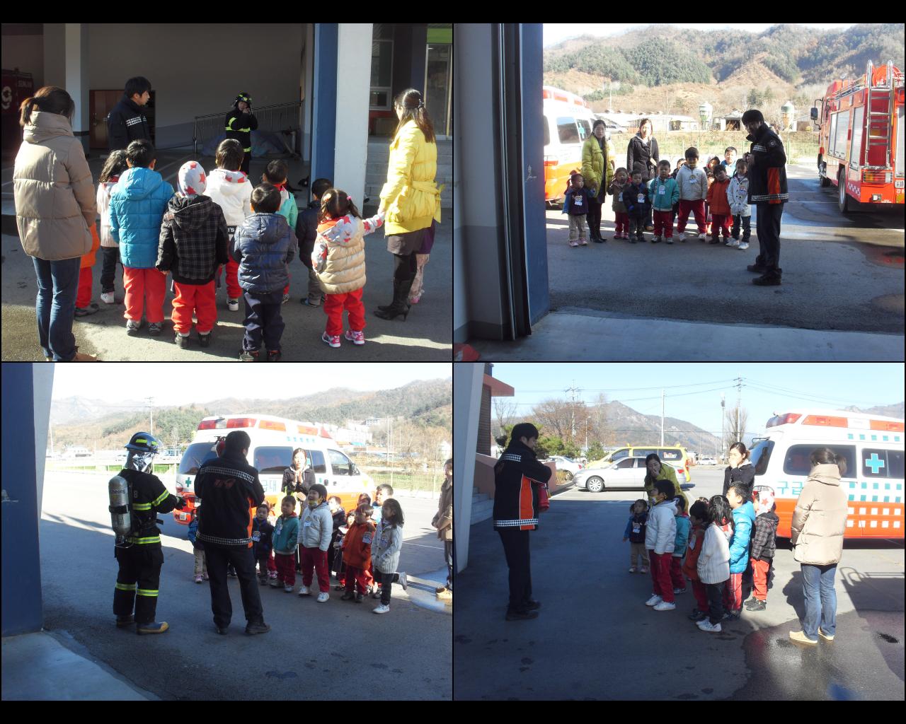 소방차와 구급차에 대한 설명, 방수포 시범, 소방관 복장착용, 소화기 사용 등의 시범을 보이며, 평소 생활 속에서 불조심 하는 방법을 가르쳐 주었습니다.