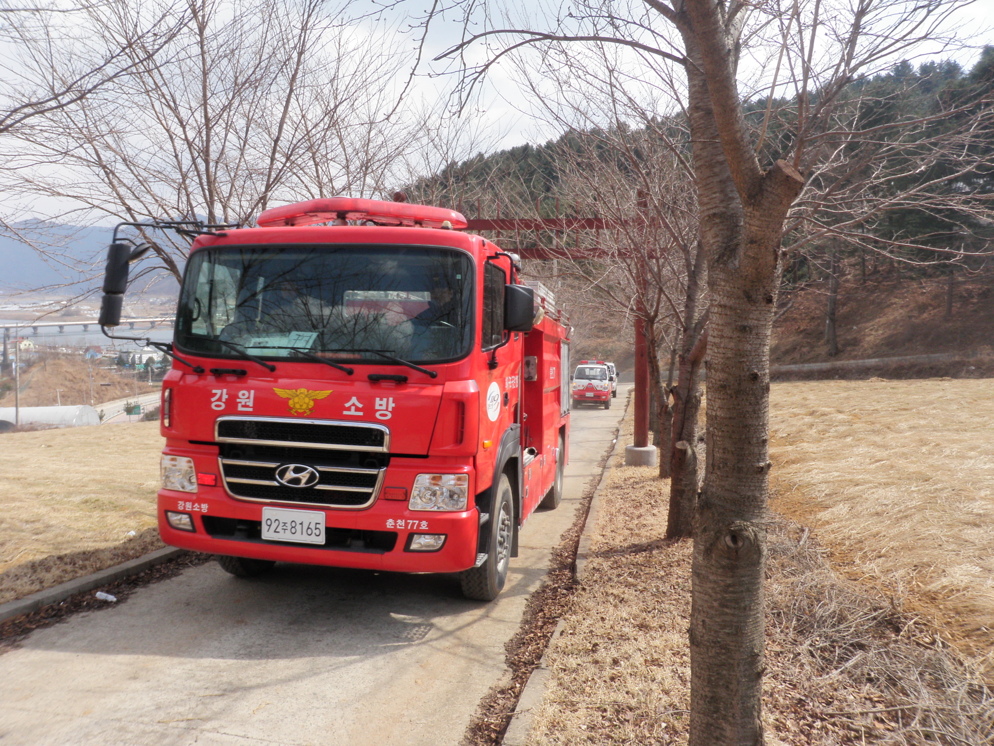 이날 훈련은 소방차량 3대,의소대차량 1대, 화천군 진화차량5대,군임차헬기 1대와 70여명의 인원이 동원되어 화재발생시 초기대응방법, 들불 및 산불 연소확대 저지, 주변 소방용수시설 확보법 등의 사항을 중점 실시하였다.