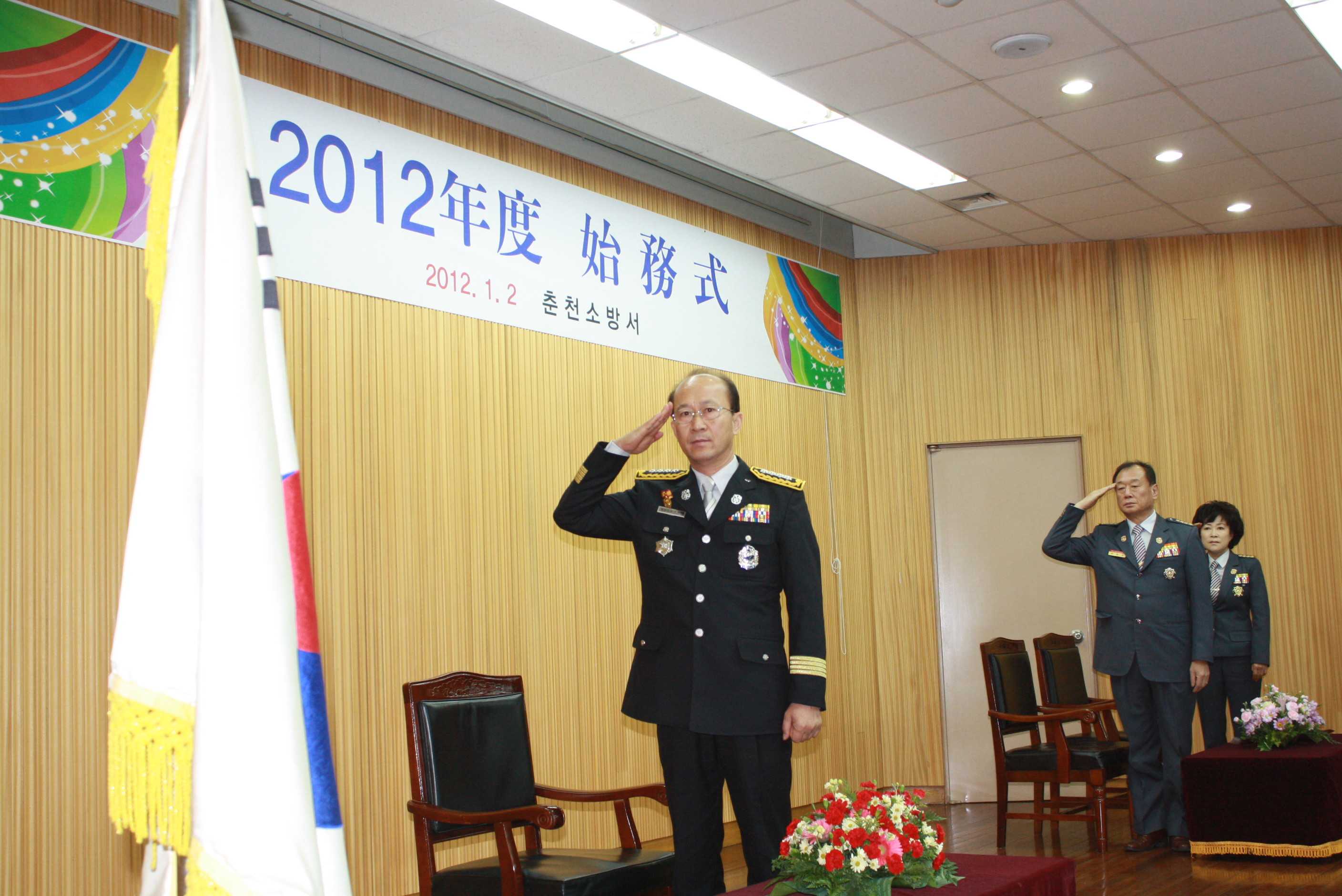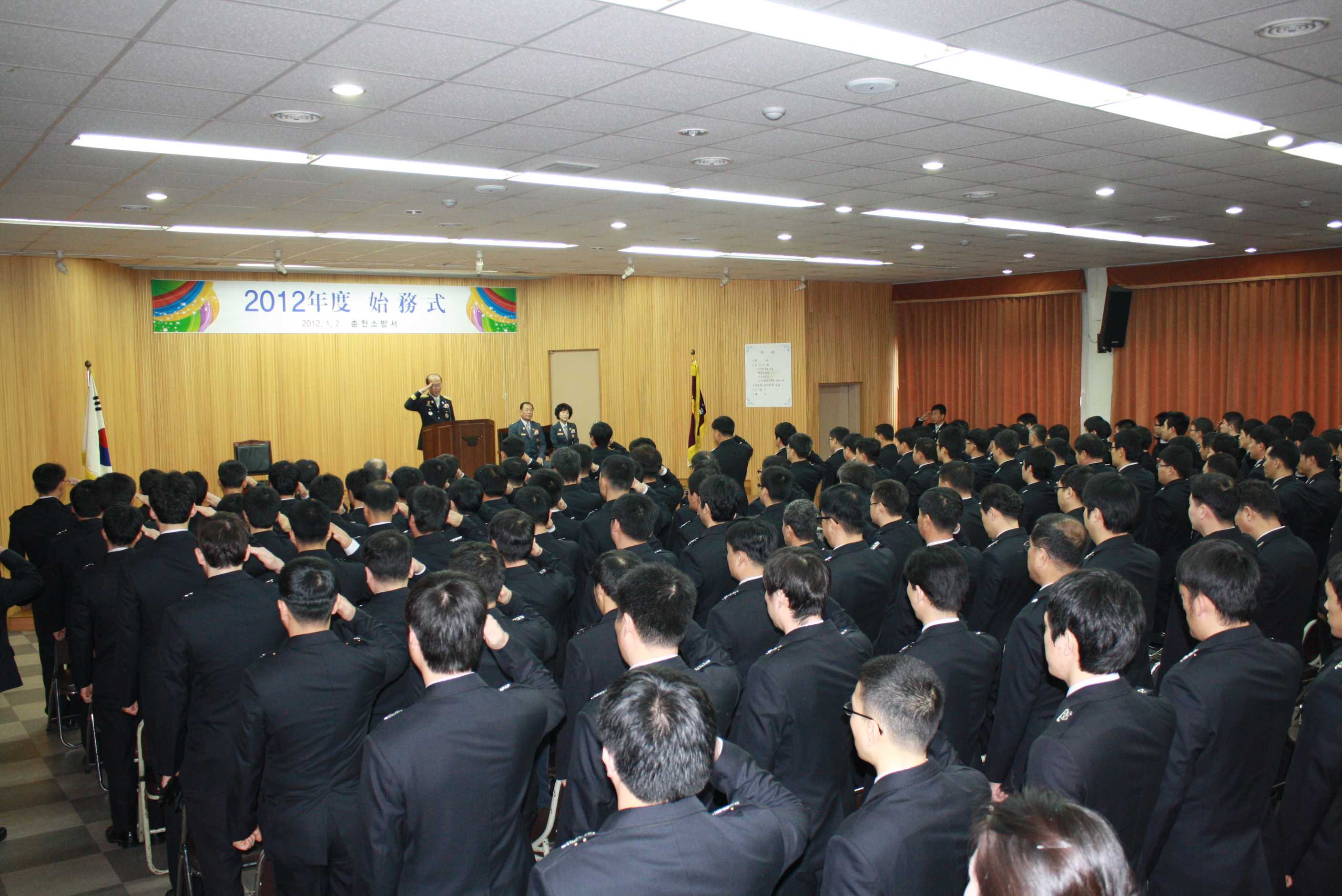 춘천소방서(서장 조완구)는 2012.1.2(월) 10:00 대회의실에서 2012년 시무식 행사를 가졌습니다. 서장님께서는 올해에도 언제나 안전할 것을 그리고 공직자로서의 품위를 지킬 것을 강조하셨습니다.