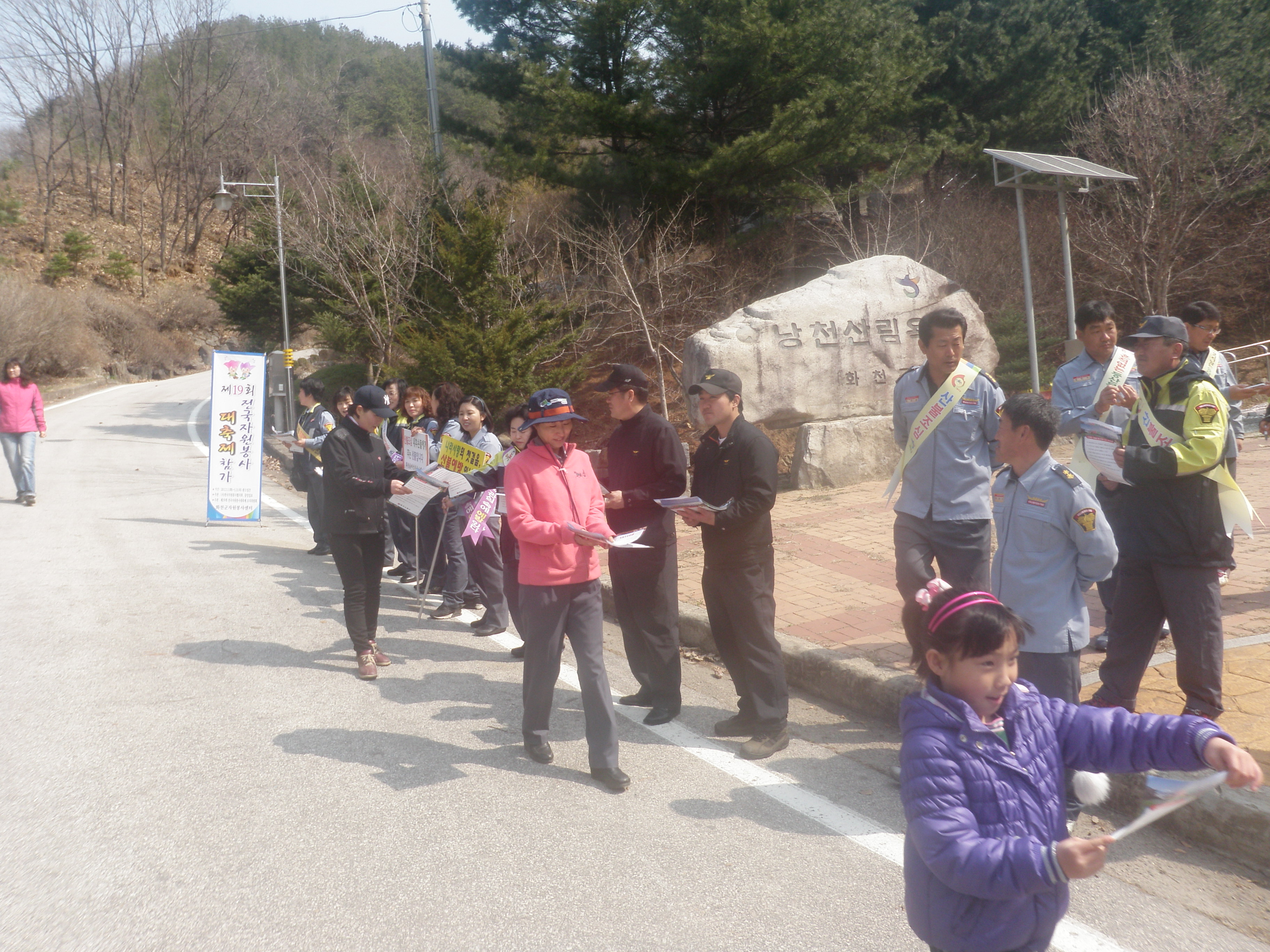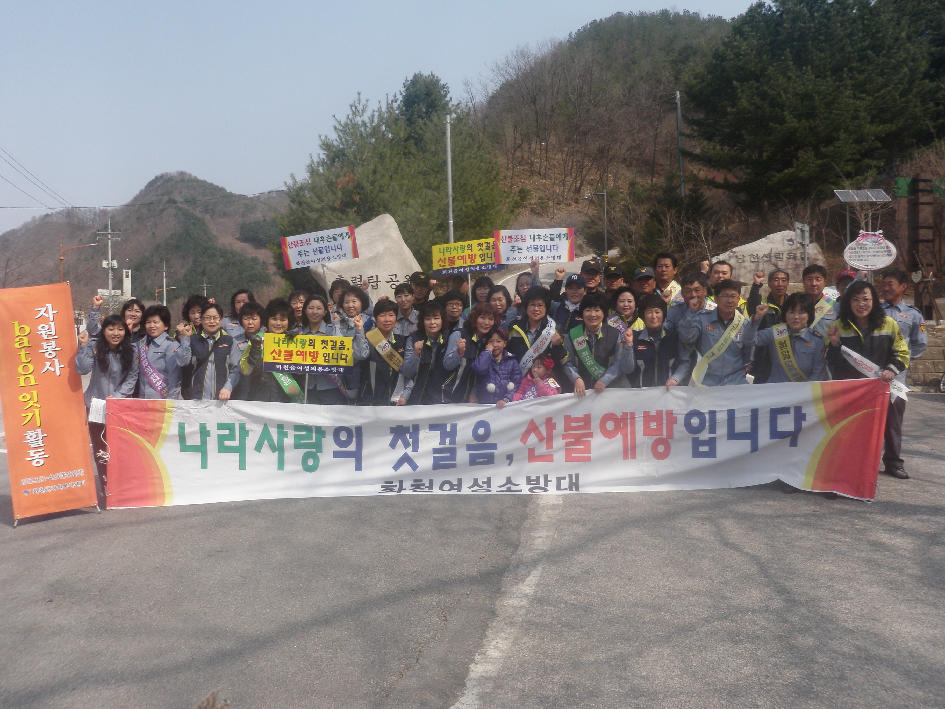 화천119안전센터(센터장 신상건)에서는 2012년 4월 8일(일) 오전 10시부터 낭천산림욕장 등 주요 등산로 입구에서 소방공무원 및 의용소방대원 약 80여명이 참석한 가운데 산불예방 캠페인을 실시하였습니다.