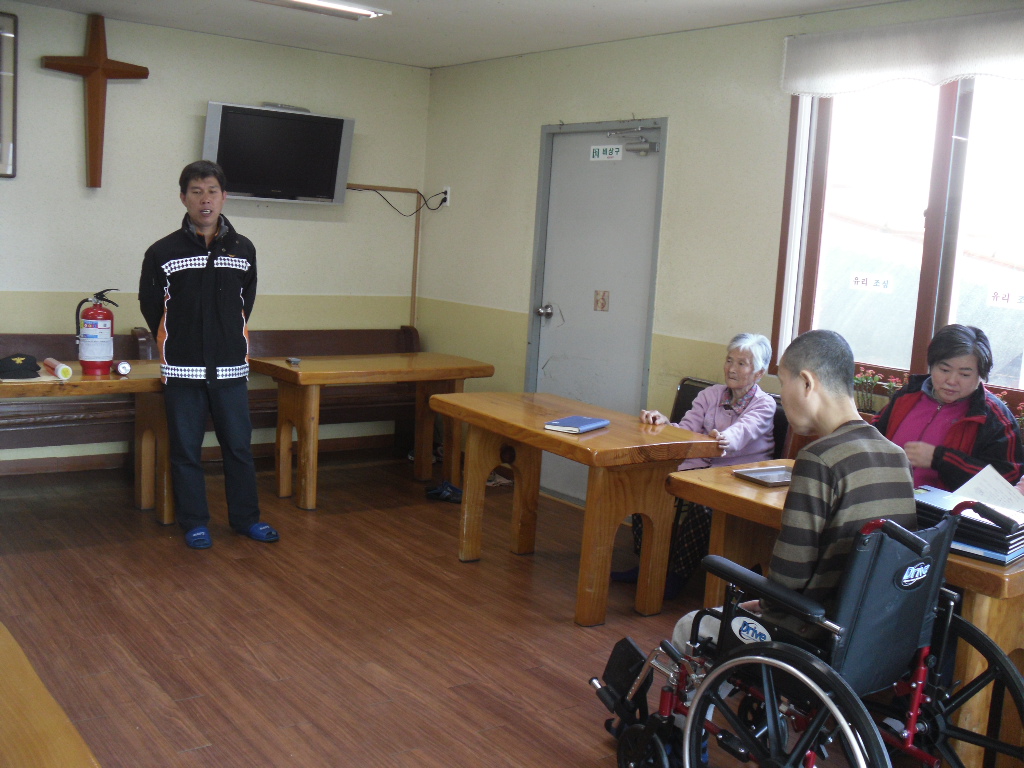 <쉼동산>에서 소방훈련을 실시하였습니다. 오늘 훈련에서는 소방안전관리자 임무 , 소화기와 간이소화용구 사용법 및 화재 시 대피 요령 등에 대해서 훈련을 실시하였습니다.