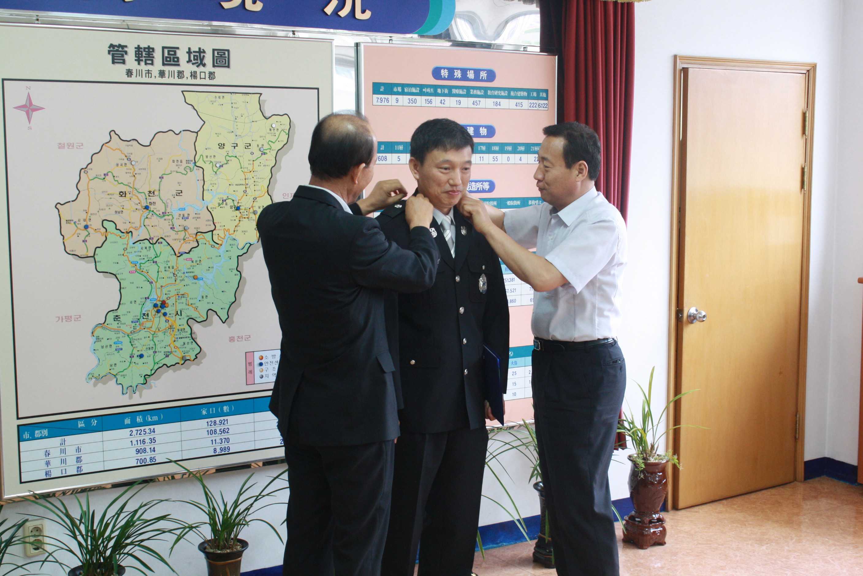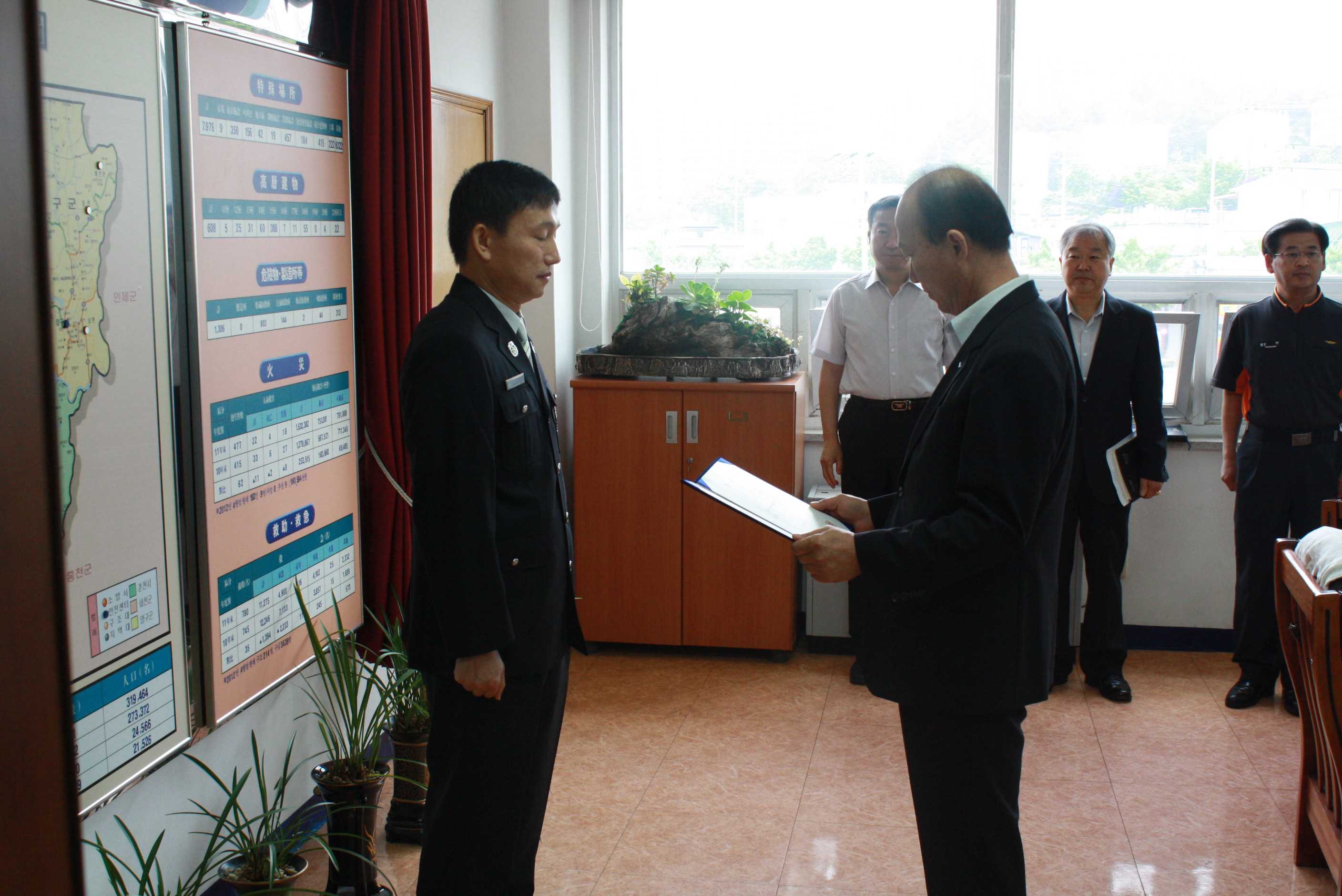춘천소방서(서장 조완구) 에서는 2012.05.18(금) 승진임용된 직원(소방위 이철한)에 대한 신고식을 가졌습니다. 서장님께서는 그동안의 노고를 치하하셨고, 앞으로도 더 열심히 도민의 안전을 위하여 노력하여 줄것을 당부하셨습니다.
