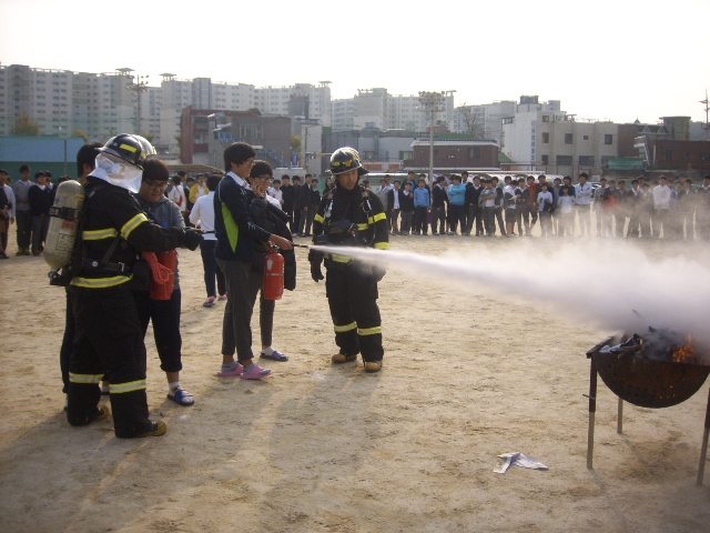 실전을 방불케한 신속한 대피와 신고, 출동지령을 받고 출동한 진압대의 화재진압, 구급대원의 환자이송, 소화기 사용법 교육 등 화재진압 체험과 소방안전교육을 실시하였습니다