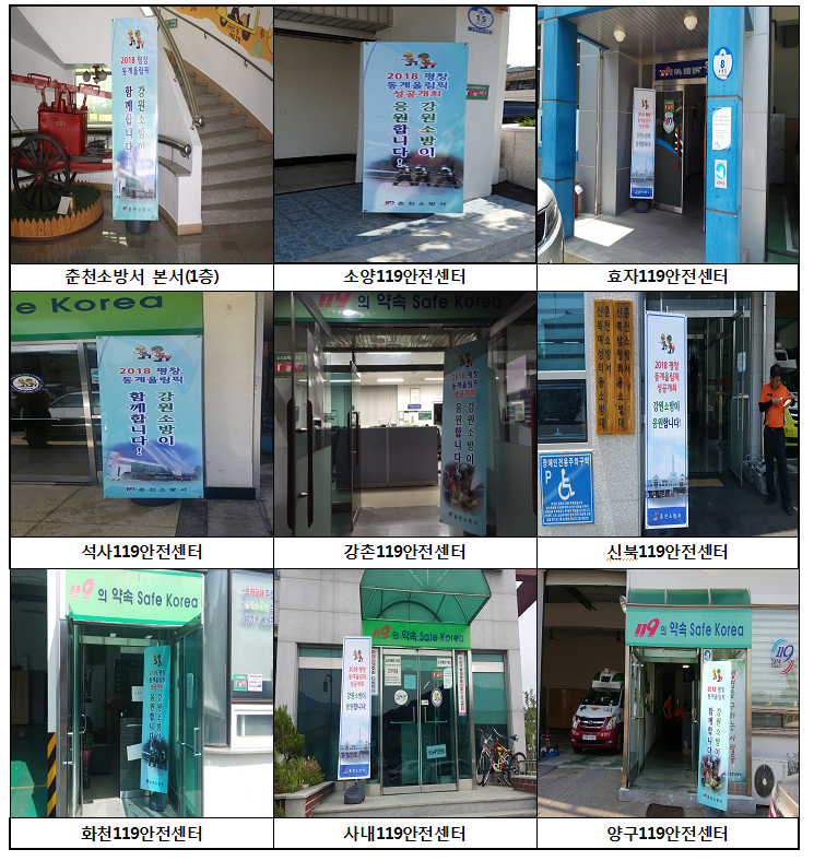 춘천소방서(서장 박창진)는 10일 2018 평창 동계올림픽의 성공적 개최를 위한 범도민 홍보를 강화하고자 본서를 비롯하여 전 센터에 홍보용 배너를 설치했습니다.