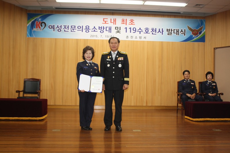 춘천소방서(서장 박창진)는 7. 15(수) 11:00 대회의실에서 『도내 최초 심폐소생술 전문여성의용소방대 및 119수호천사』발대식을 개최했다. 춘천여성전문의용소방대는 대원 40명 중 29명(72.5%)이 일반인강사 자격 등을 취득하였으며 또한 춘천시 소재 의용소방대원 중 총 68명을 119수호천사 생명지킴이로 위촉하여 학교, 관공서, 지역단위 축제장, 지역주민 등 교육을 필요로 하는 곳에 응급처치 및 심폐소생술 교육을 실시하여 주민의 생명 지킴이로써의 역할 뿐만 아니라, 2018평창 동계올림픽의 성공적인 개최를 지원하기 위한 안전분야 자원봉사 인력도 확보하였다.