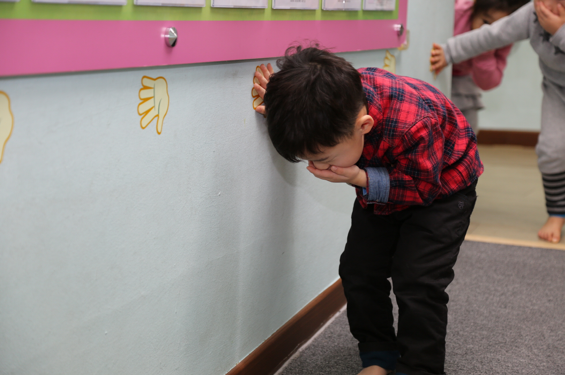 1.22(금) 10시, 춘천시 후평동에 위치한 사회문화 어린이집 원생들이 춘천소방서에서 자체 특별 제작한 피난유도 스티커(생명의 손)를 짚고 건물 밖으로 대피훈련을 하고 있다.