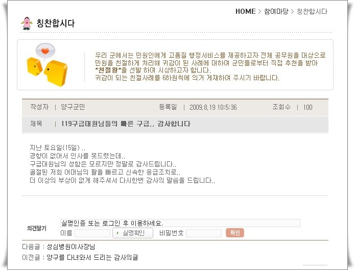 | 35 | 우리 칭찬 받았습니다.^^ | 양구119안전센터 | 2009-08-21 | 1499 | |
