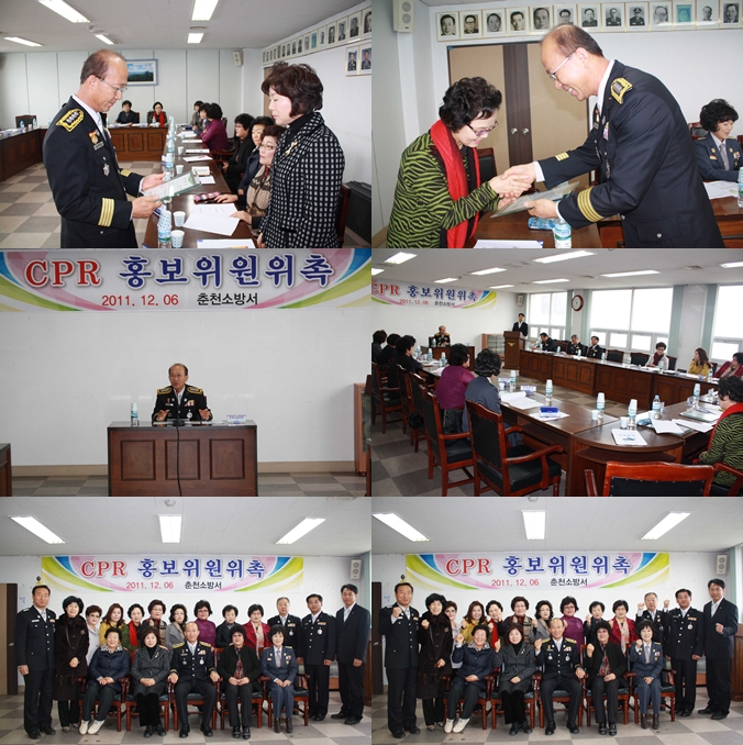 춘천소방서(서장 조완구)는 6일 오전 10시 본서 소회의실에서 범시민 생명안전문화 조성과 심폐소생술보급 및 확산운동 추진을 위해 춘천시 여성단체협의회장단 18명을 심폐소생술 홍보위원으로 위촉했습니다.