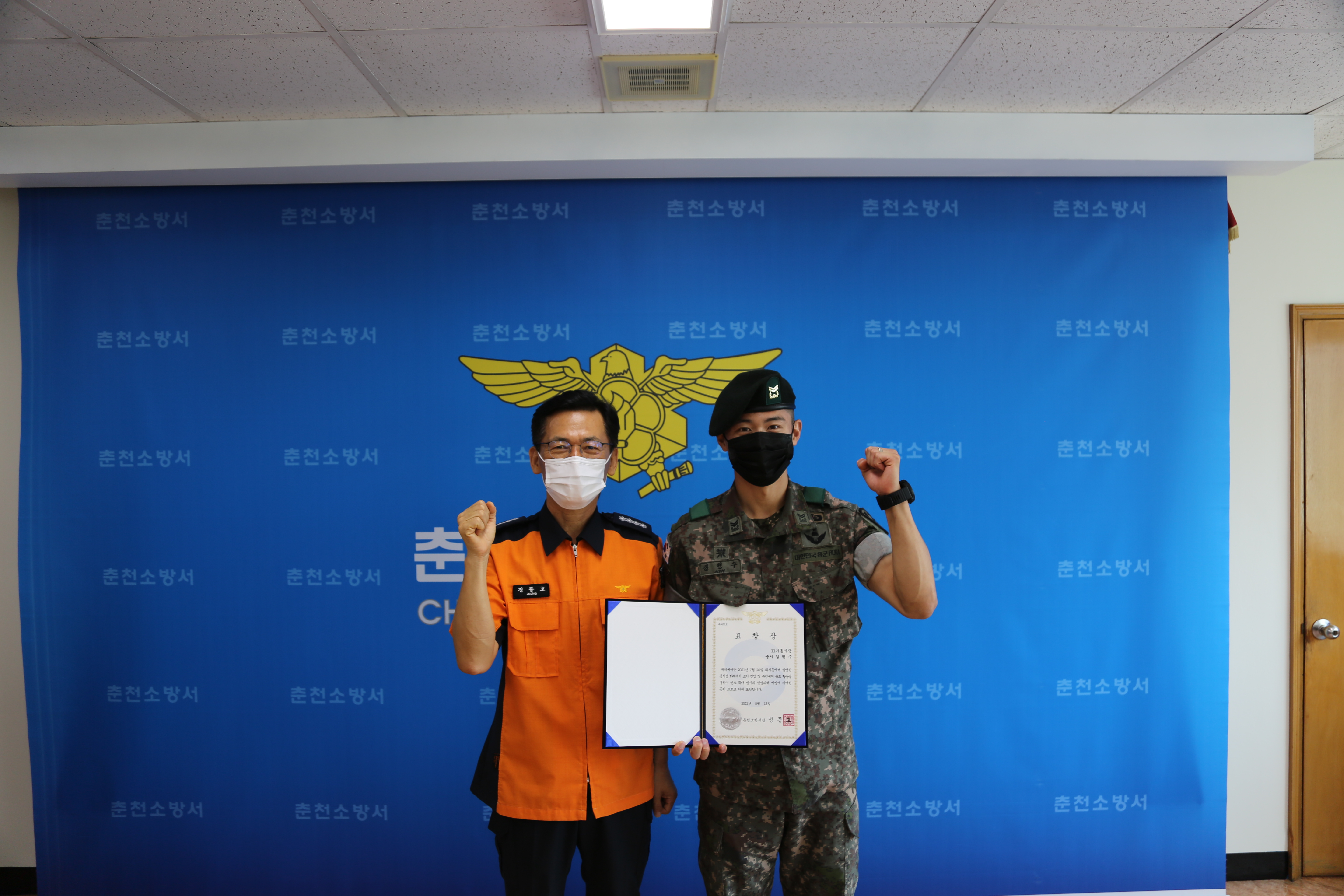 ○ 유공자 중사 김현수씨는 11기동사단 소속으로 지난달 20일 퇴계동의 한 음식점에서 화재가 발생한 것을 인지하고 소화기를 이용해 초기화재진압을 실시했으며, 현장 주변의 아이들을 대피 시키는 등 인명·재산 피해 예방의 공로를 인정받았다.
