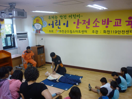화천119안전센터는 17일 방과후 학교인 드림스타트 프로그램에 참여하고 있는 초교생 20여명을 대상으로 심폐소생술, 소화기 사용법 등의 소방안전교육을 실시했다.