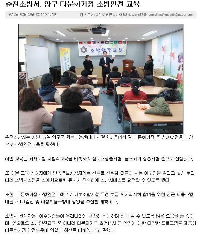 <신아일보> 춘천소방서 양구 다문화가정 소방안전교육