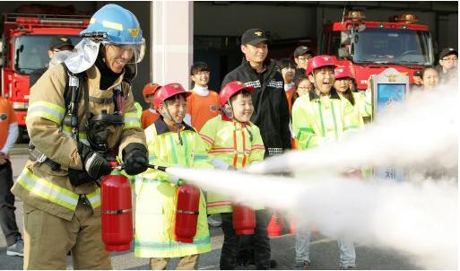 최문순 지사가 9일 춘천소방서에서 119소년단과 함께 일일 소방안전체험 행사에 참여해 소방관복을 입고 소화기로 불끄는 시범을 보이고 있다.(강원일보)