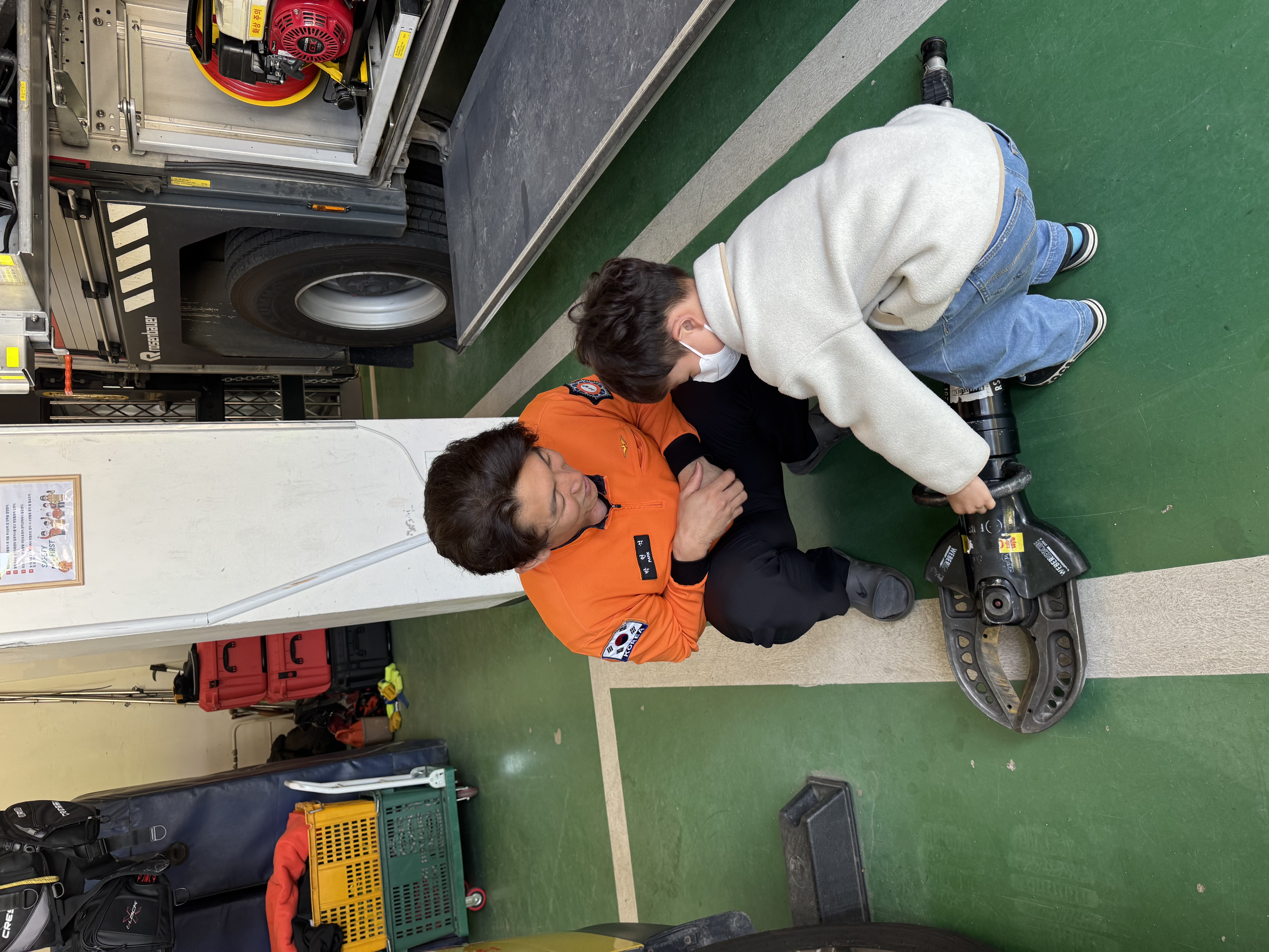 박현석 소방관님께서 아이에게 구조공작차에 대해서 자세히 설명해주시고