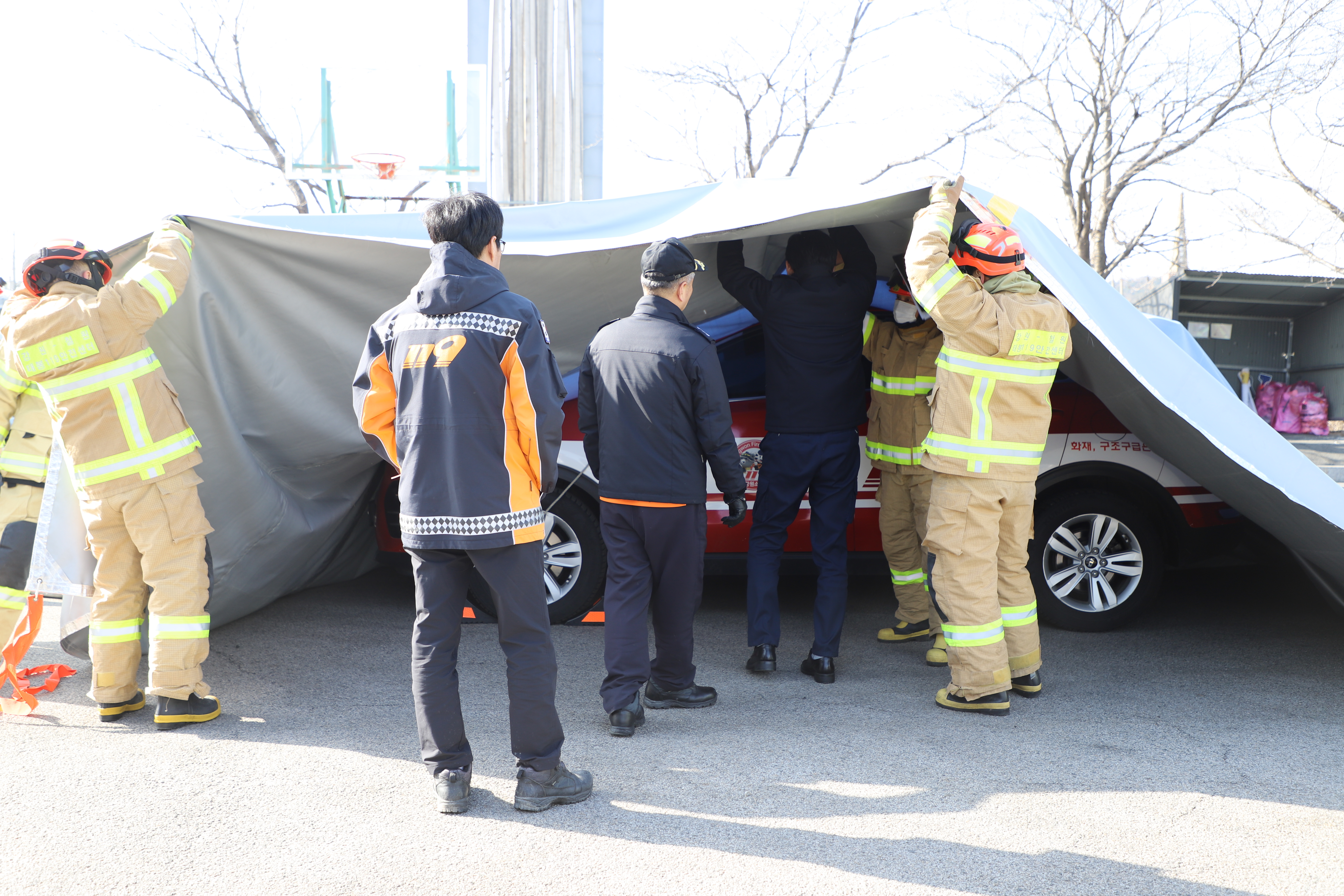 이를 대비하기 위해 훈련 절차는 ▲전기자동차 화재 특성 및 진압 동영상 교육 등 도상훈련 ▲질식소화포 활용 훈련 및 진압 관창 대응 훈련 ▲전기차 화재대응 전략 토론 등으로 진행되었다.