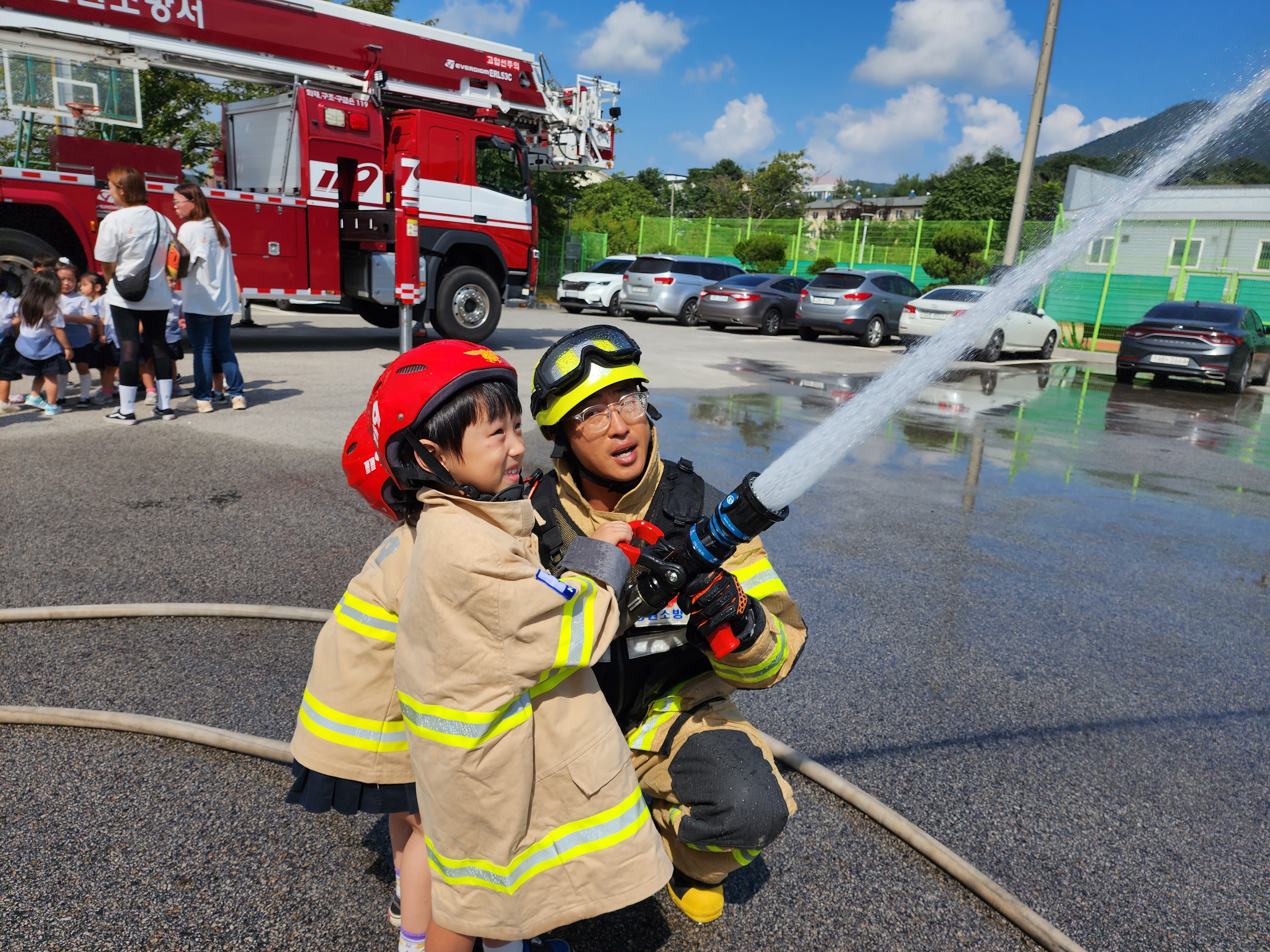 어린 아이들이 제일 관심을 가지고 있는 부분이 사실 다양한 종류의 소방차인데 여러 차량이 들어오자 "우와~"감탄사가 절로 나왔습니다.