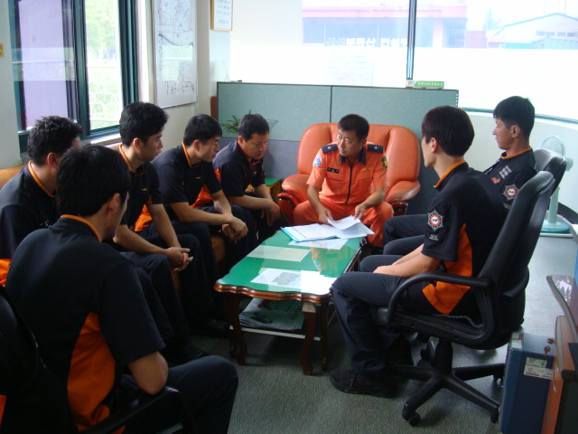 2010.08.16(월) 오전 안전관리 교육시간에 센터장외 8명은 출동 및 각종 훈련시 안전수칙 준수, 개인안전장구류 착용 및 점검 철저, 차량 안전운행, 비상시 차량 응급처치법 숙지 등 안전사고 예방교육 실시함