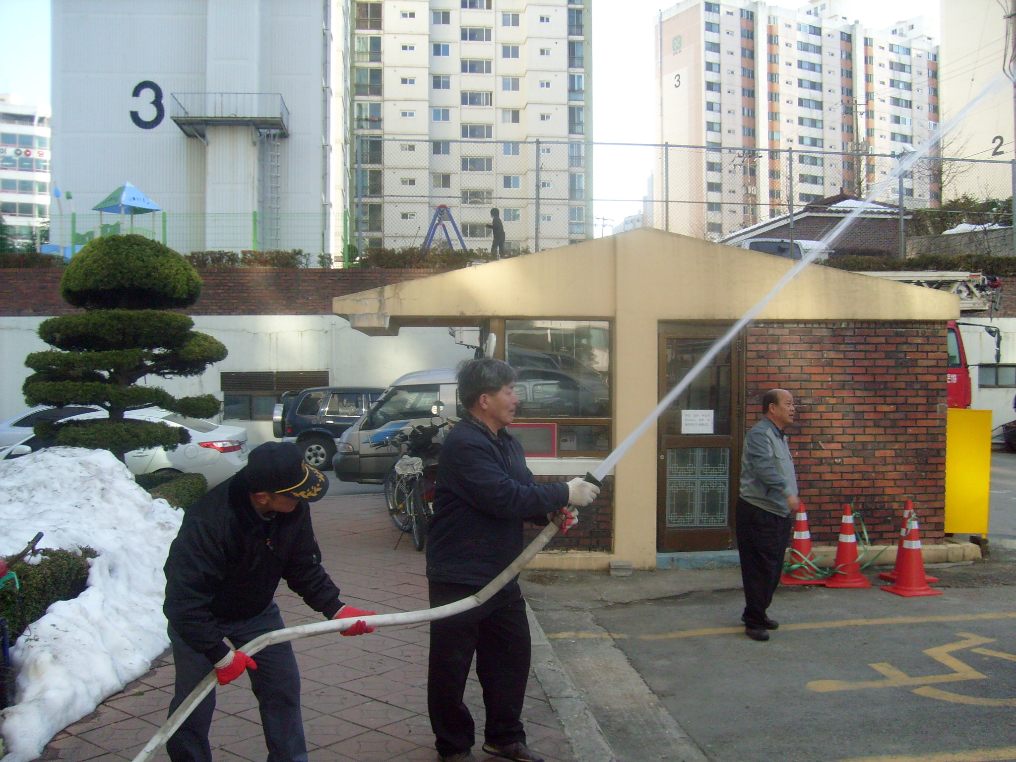 소방관계자들은 화재발생에 대비하여 아파트내에 있는 소화전에서 호스를 전개하여 실제 방수훈련도 해 보았다.