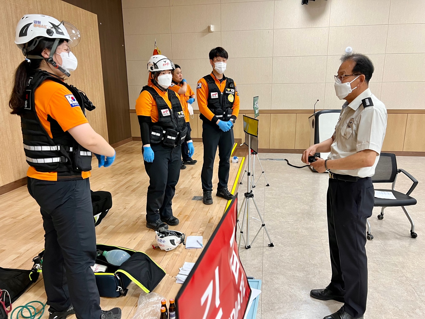 금일(5월24일) 14시경 동해소방서장님께서 소방기술경연대회 속도방수팀(공설운동장), 드론팀(청사 후정), 구급팀(본서 3층 대회의실) 훈련장소를 직접방문 위문 및 격려하였습니다.