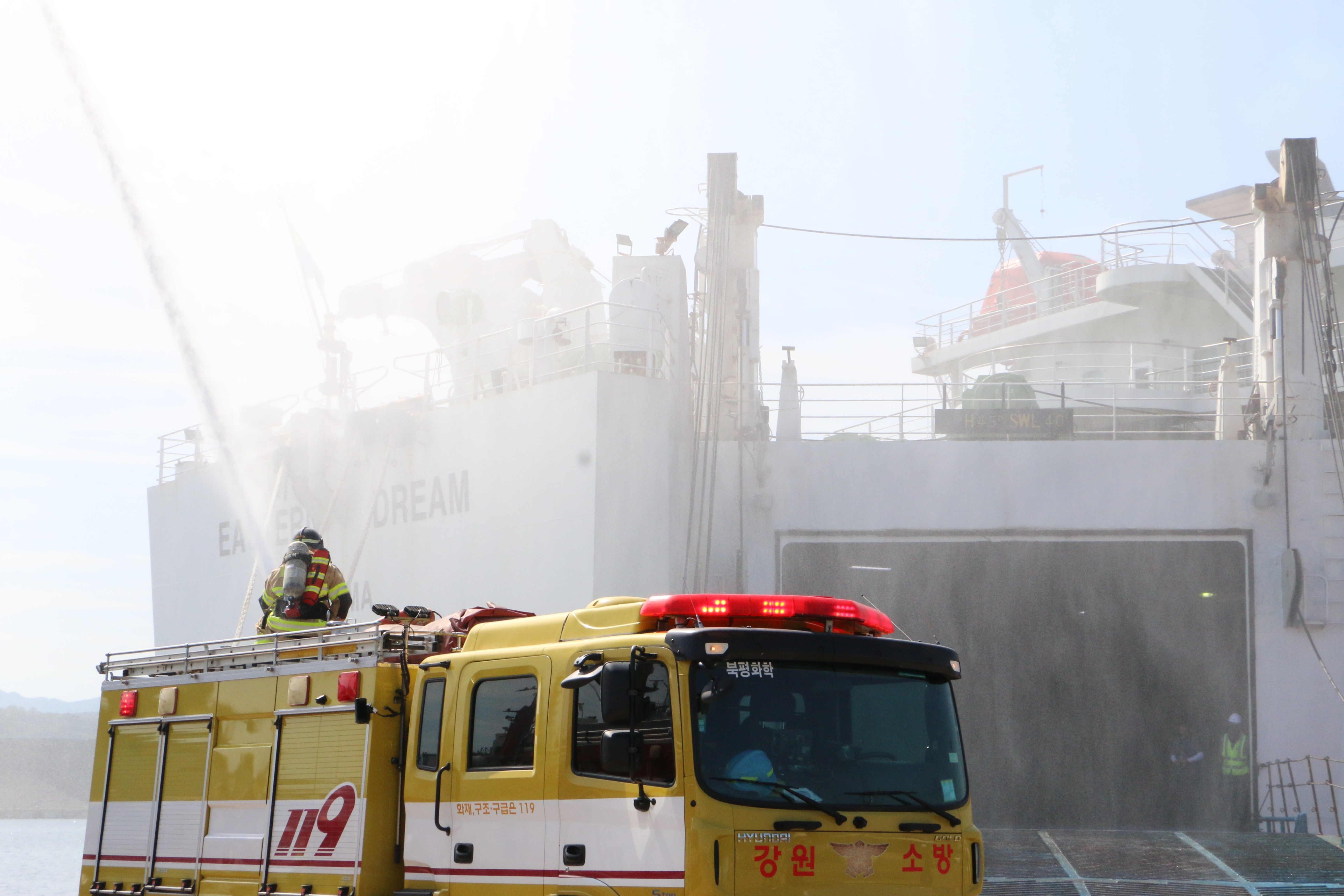 동해소방서(서장 강윤혁)는 15일 동해항에 정박한 국제 여객선 이스턴드림호에서 유관기관 합동 소방훈련을 실시했다. 훈련은 동해지방해양수산청 주관으로 진행됐으며, 동해해양경찰서 등 유관기관이 함께 참여했다.