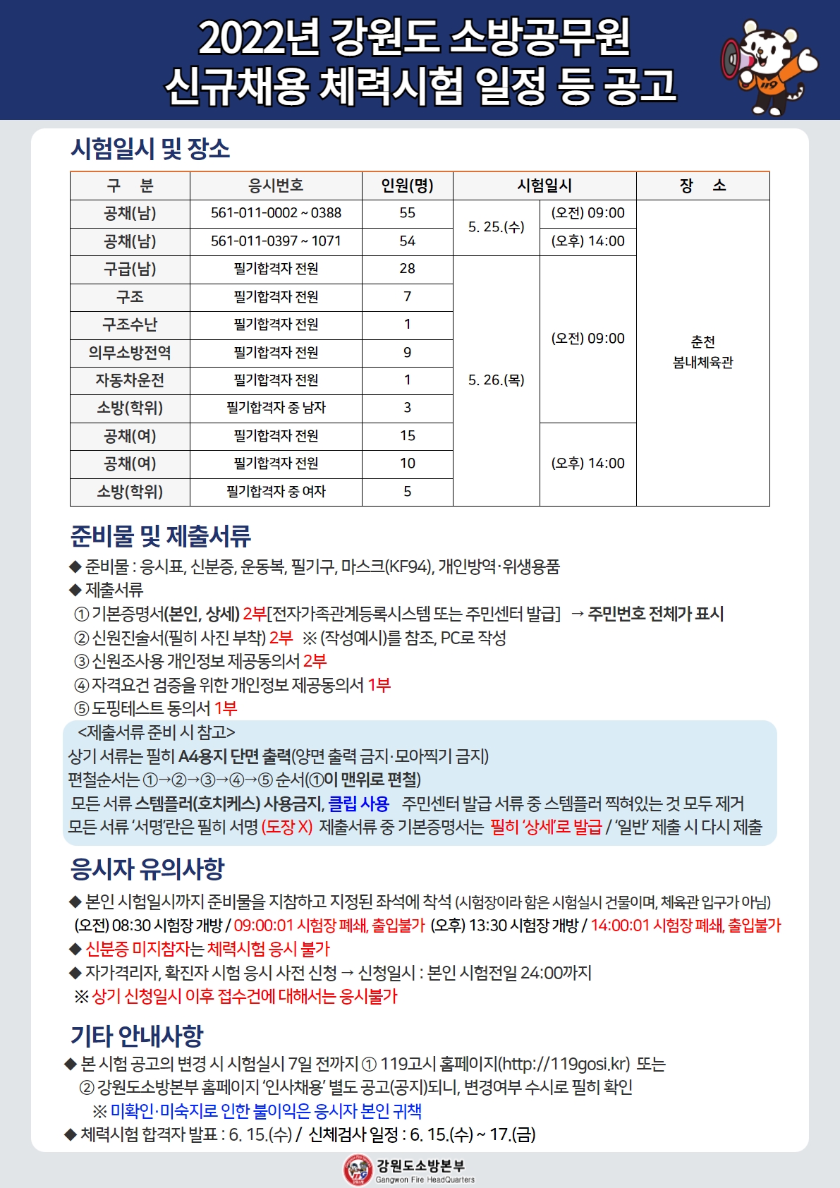 2022년 강원도소방공무원 신규채용 체력 시험일정 안내