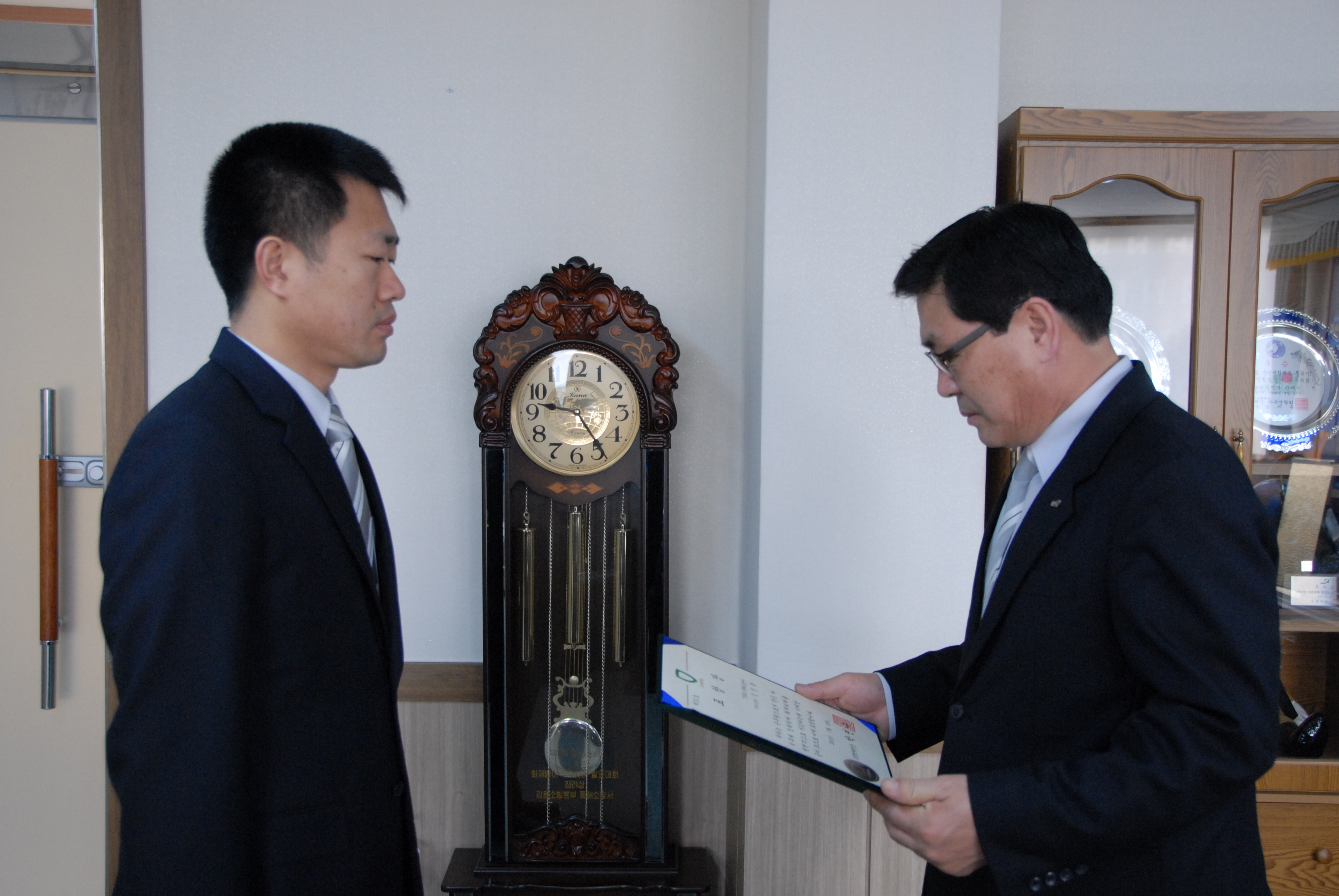 동해소방서 서장 김남숙은 화재와의 전쟁 유공자 표창을 소방위 김진문에게 전수하였습니다.