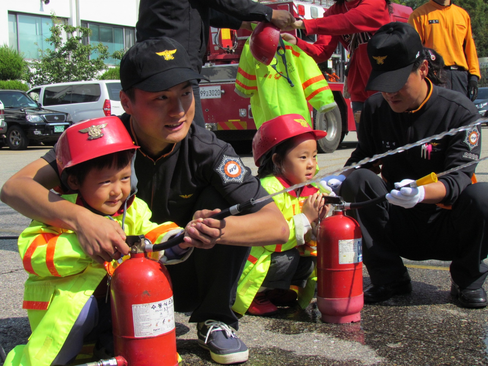 오늘 교육은 물소화기 체험, 119신고요령 교육,