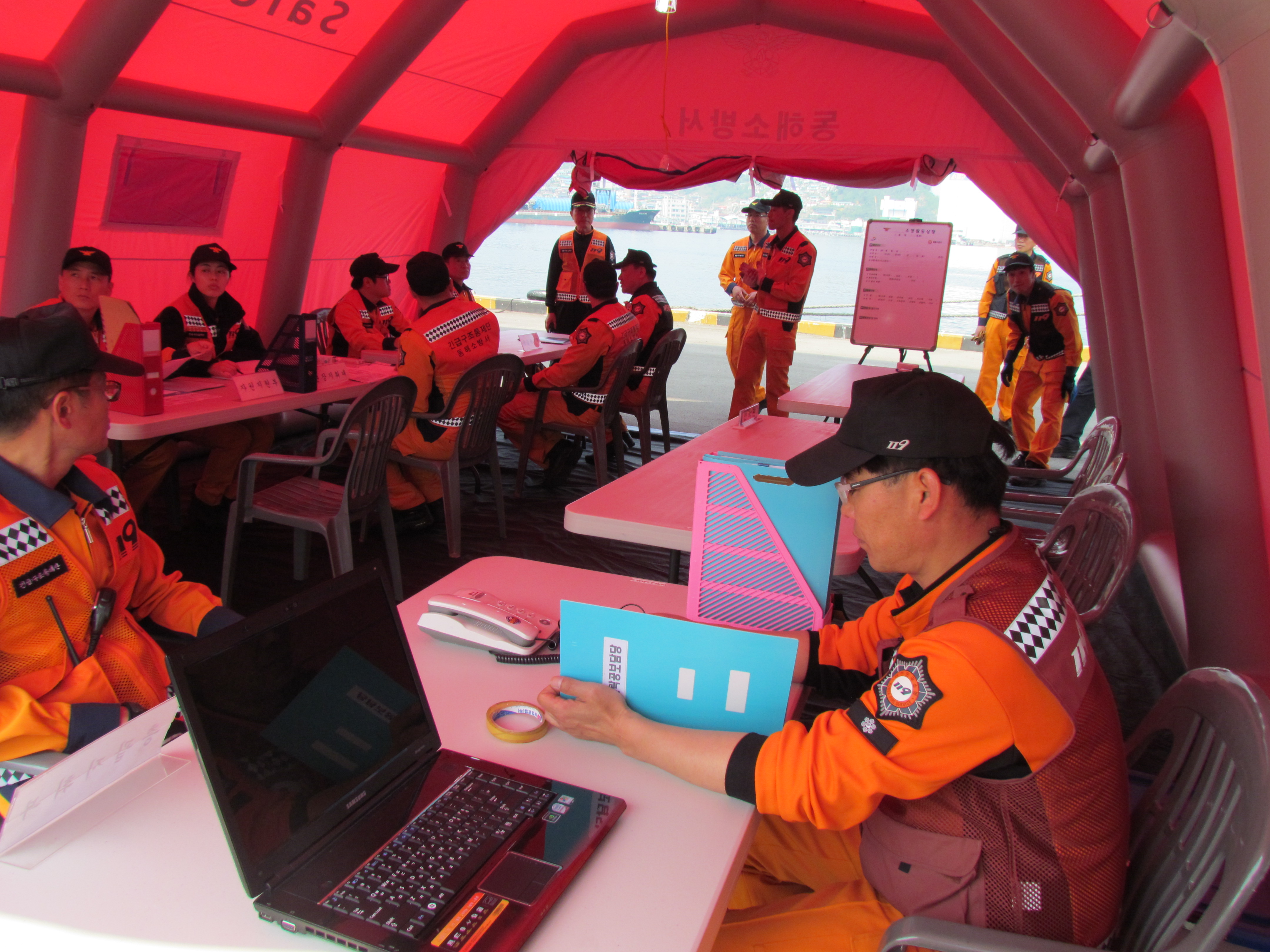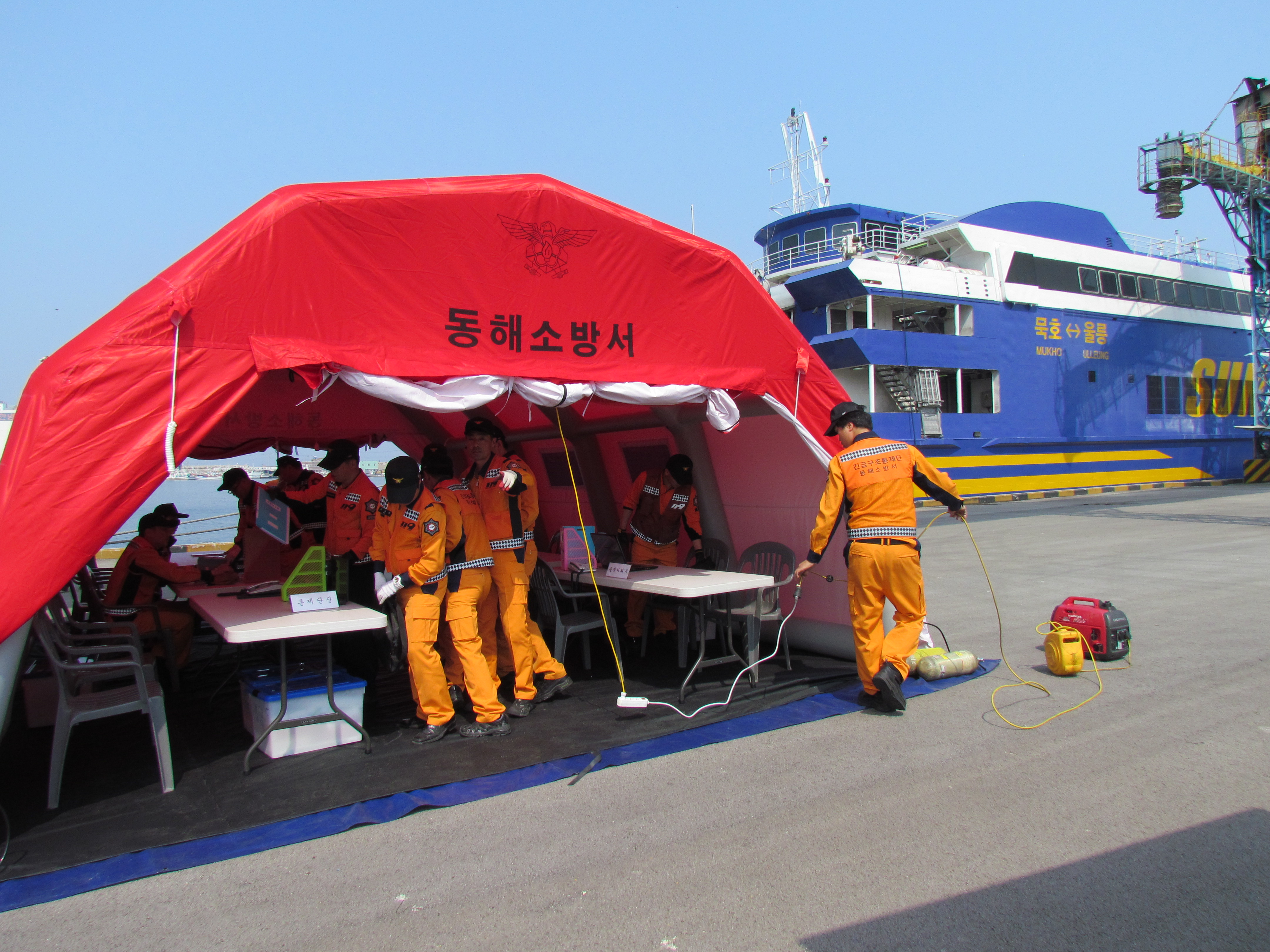 동해소방서(서장 주항중)는 2014.4.25(금) 오후 묵호항에서 긴급구조통제단 가동훈련을 실시하였습니다. 임무숙달을 위해 매월 실시하는 훈련으로 유사시 신속한 대처를 위해 지휘체계를 숙달하고 미비점을 보완하는 자리가 되었습니다.