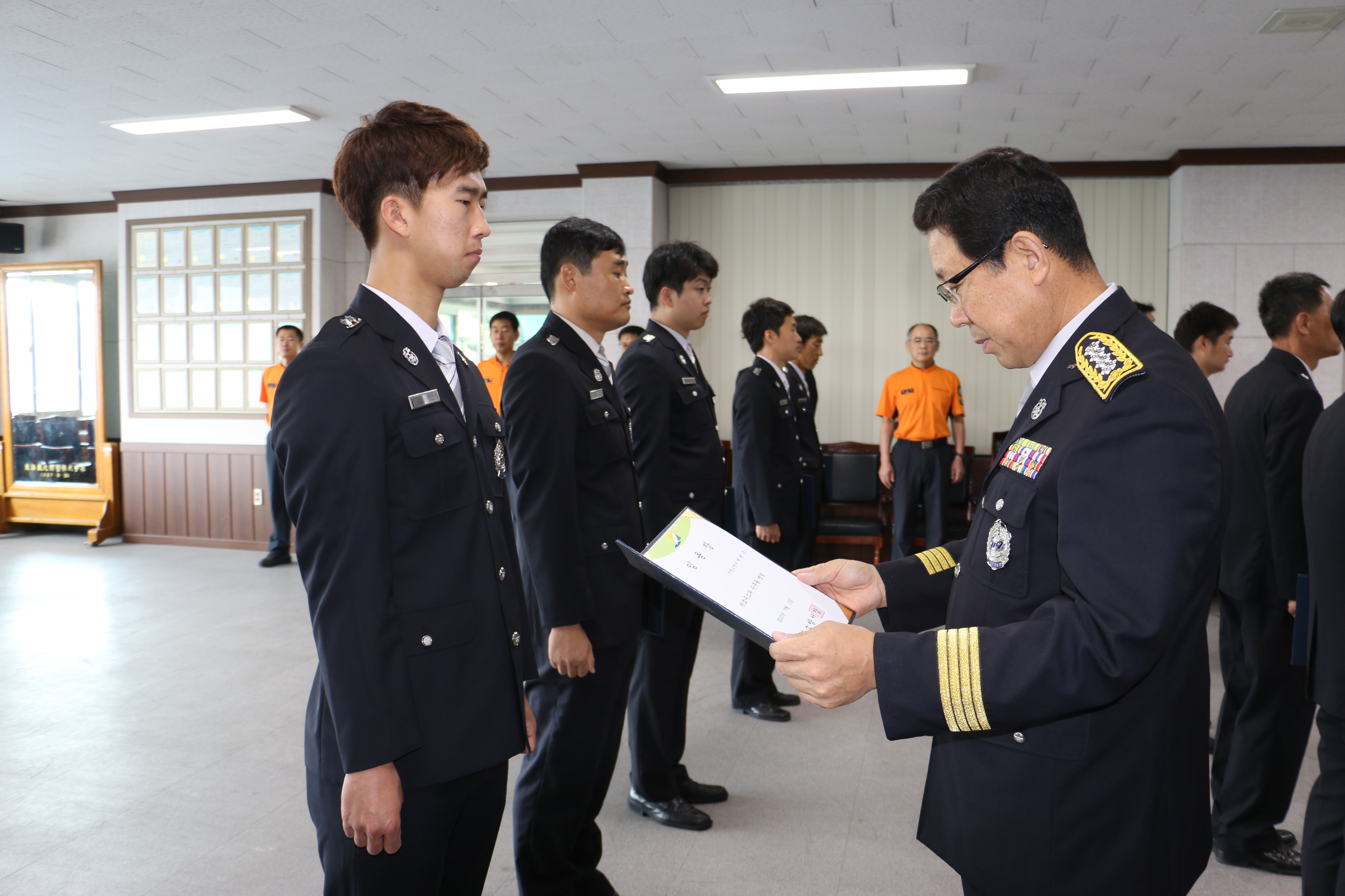 동해소방서(서장 주항중)는 3일(금) 오전 9시 소방서 2층 대회의실에서 7.3자 서내 인사발령자 16명중 승진자 1명 및 신규임용자 4명을 제외한 11명이 참석한 가운데 신고식을 갖고 임용장을 수여했다.