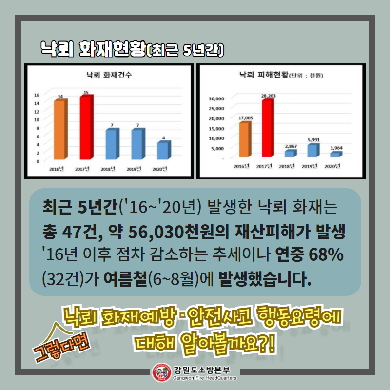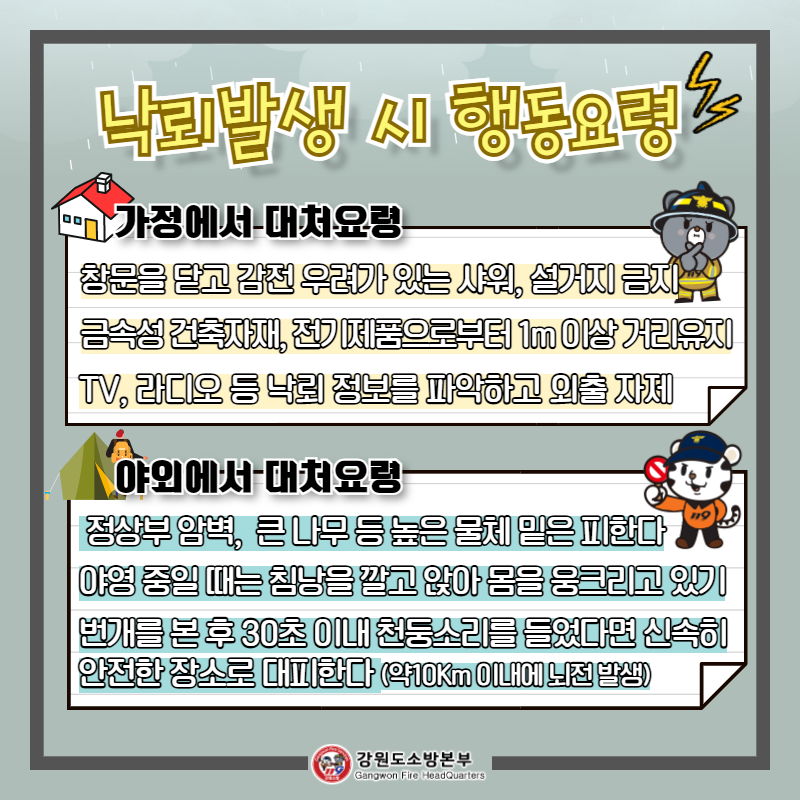 최근 기상청 예보에 따라 강원도 일부 혹은 전역에 장마와 집중호우 대비한 "장마철 낙뢰에 따른 화재예방 요령"입니다.