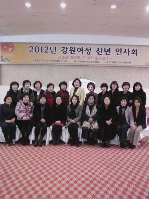 흥업여성대대장오오석(원주시여성의용소방대연합회장)은 1월10일 오전 9:20 ~2:30까지 원주 시청버스로 춘천에 다녀왔습니다.2012년 강원여성 신년 인사회를 춘천 베어스 관광호텔에서 강원도 여성단체 협의회 주최로 열렸습니다.오늘 행사에는 도내 여성관련 단체 회원들과 이광재 지사, 허천 국회의원 등 250여 명이 참석해 주셨습니다. 여성 권익보호에 기여한 공로자들에게 감사패를 수여했습니다.