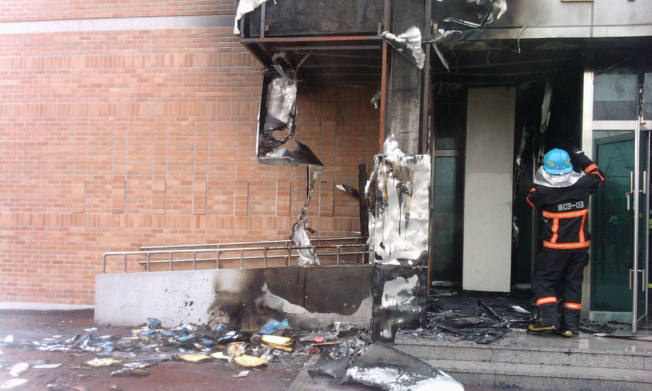 다행히도 명절연휴라 건물에 인명은 없었고 화재는 초등진화되어 건물 입구의 캐노피와 주출입구만을 태운 상태였습니다. 혹시라도 있을지모를 인명을 찾아 건물내부의 조사와 남아 있는 불씨를 끄는 작업이 이어졌습니다.