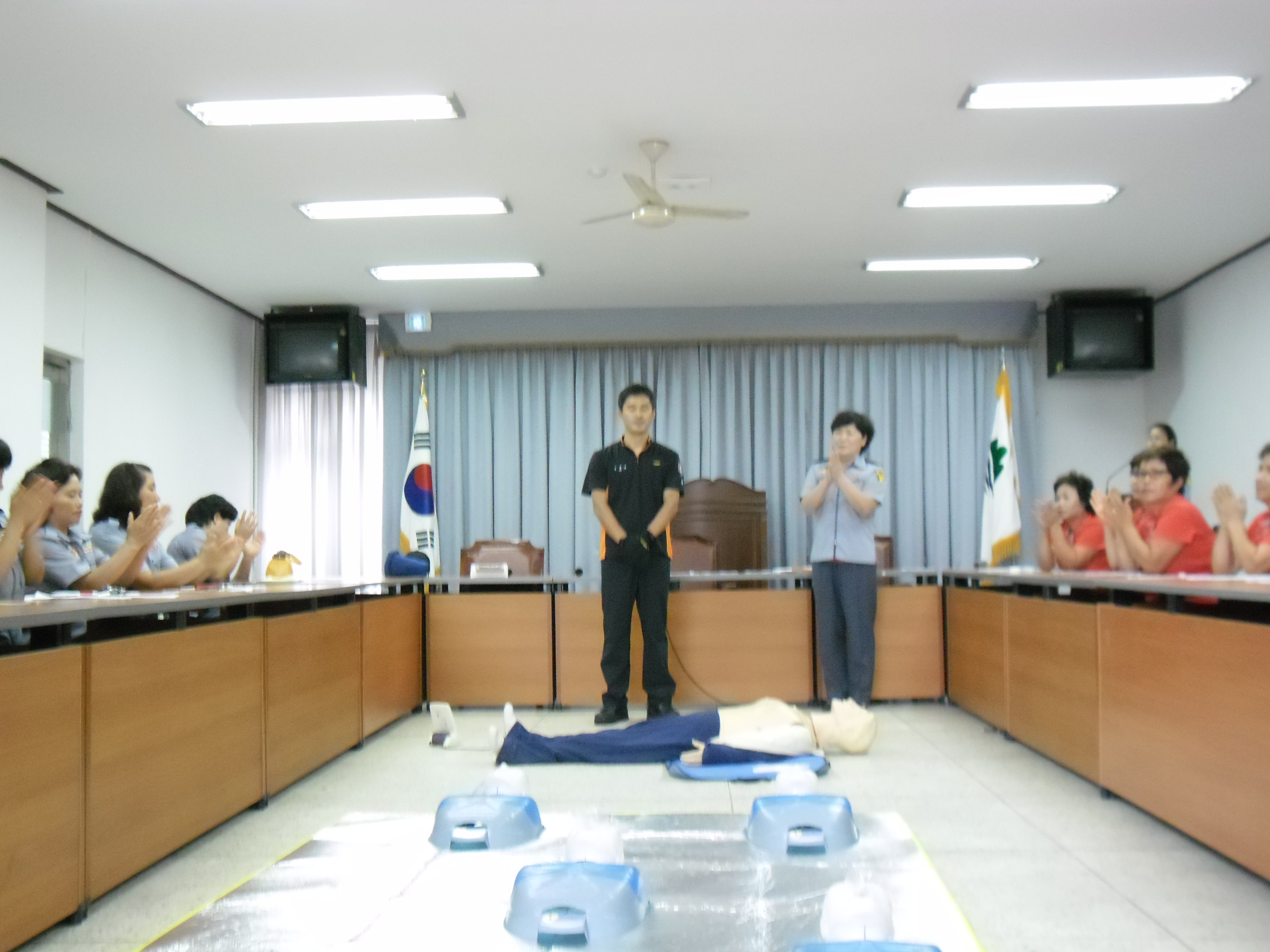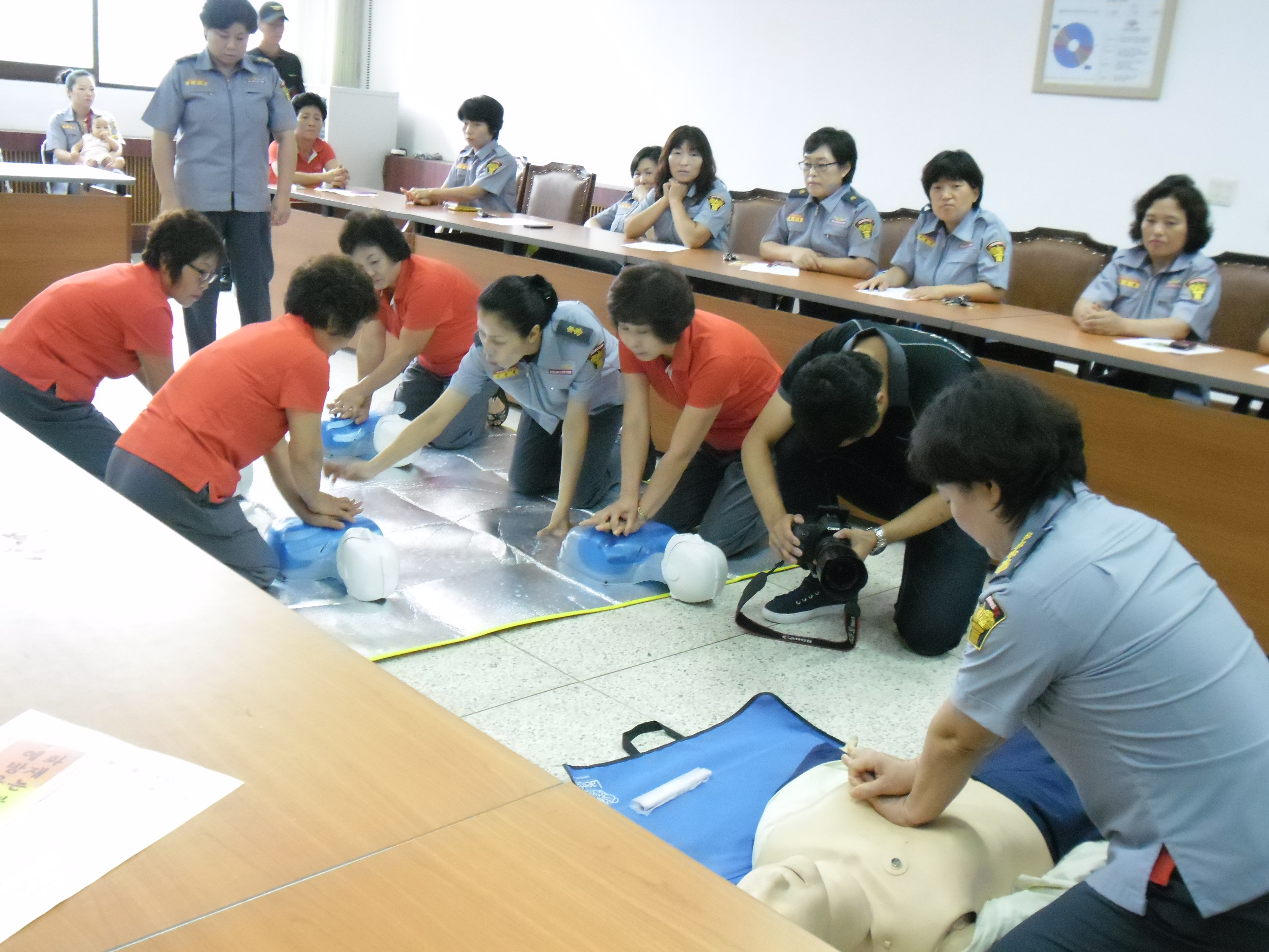 현장대응과 구조구급대 유일수 구급대장님을 교관으로 모시고 심정지환자에게 실시하는 응급처치법인 CPR교육 (흉부압박 및 자동 제세동기 사용법) 과 이물질에 의한 기도폐쇄 환자에게 실시하는 복부밀어내기법의 처치방법 등의 실습과 더불어 이후의 봉사활동 계획과 9월에 평창에서 개최될 응급처치기술경연대회에 관한 토의도 빠트리지 않았답니다.