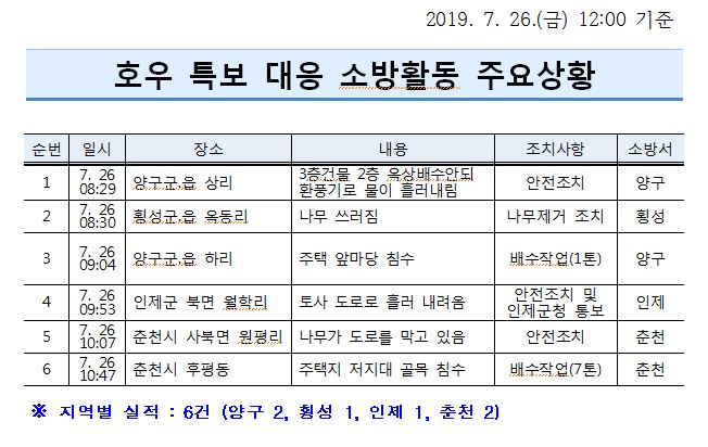 호우 대응 소방활동 상황(7. 26. 금) 12:00 기준