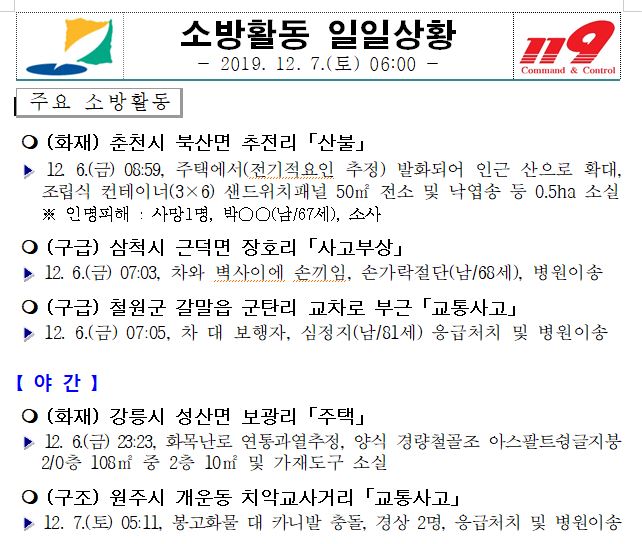 소방활동 일일상황(12. 7. 토) 06:00
