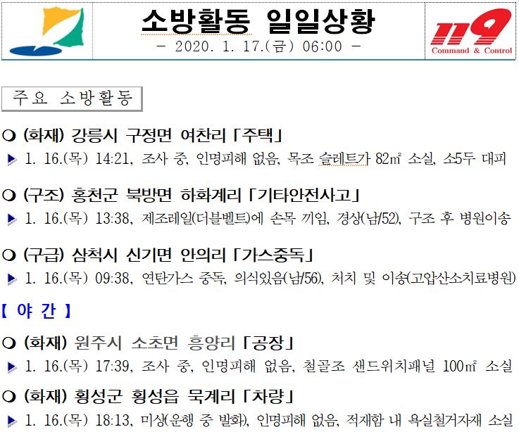 소방활동 일일상황 (1. 17. 금) 06:00