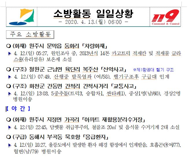 소방활동 일일상황 (4. 13. 월) 06:00