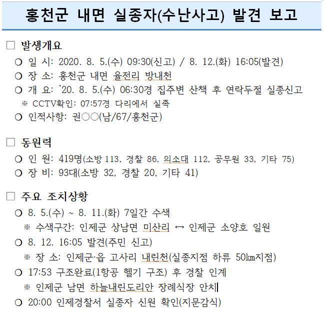 홍천군 내면 실종자 발견 보고