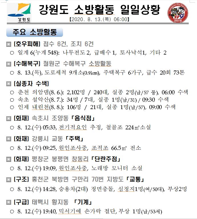 소방활동 일일상황 (8. 13. 목) 06:00