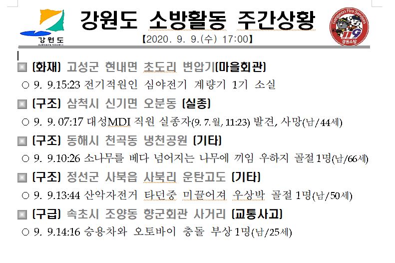 소방활동 주간상황 (9. 9. 수) 17:00