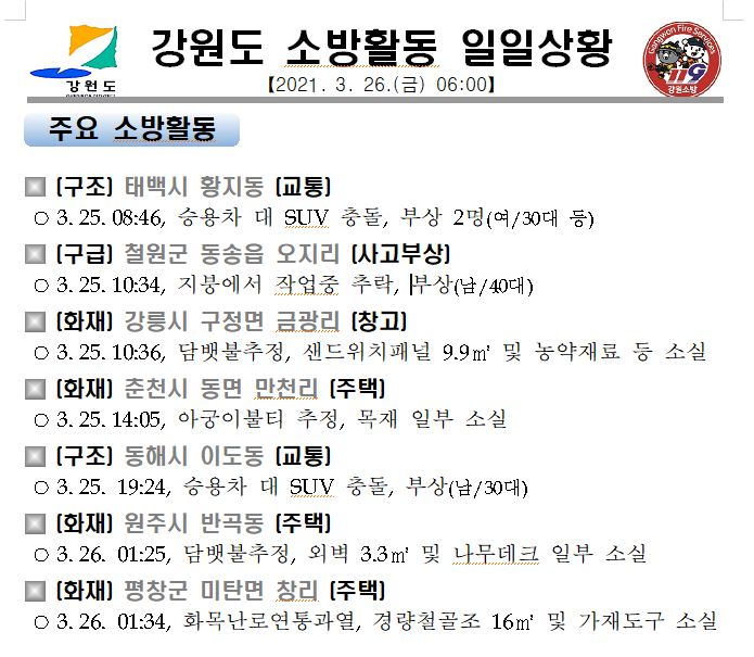 강원도 소방활동 일일상황 (3. 26. 금) 06:00