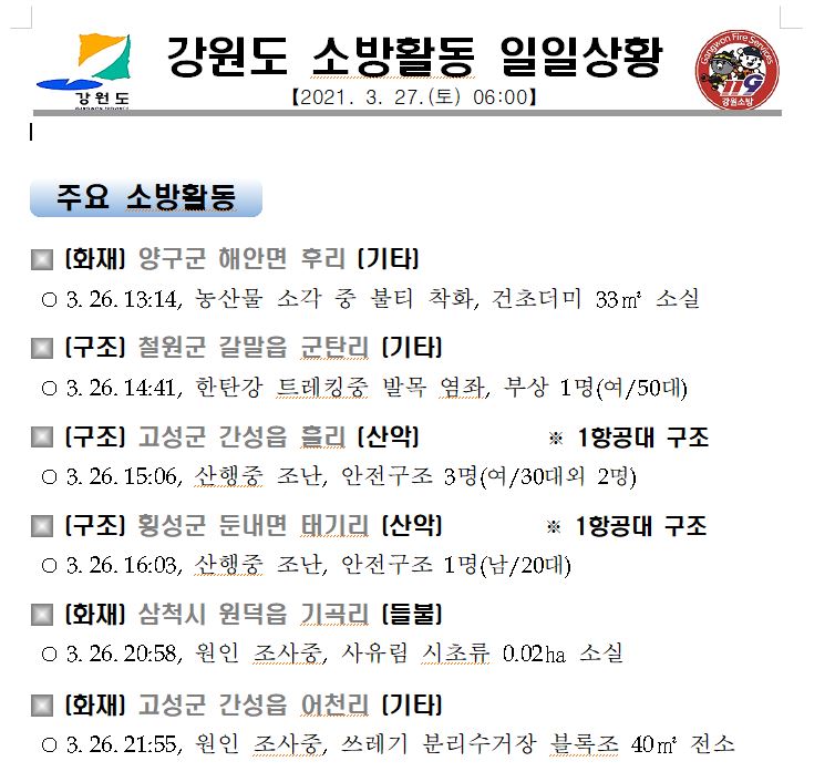 강원도 소방활동 일일상황 (3. 27. 토) 06:00