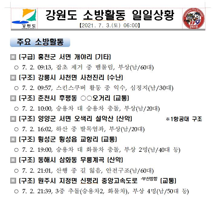 강원도 소방활동 일일상황 (7. 3. 토) 06:00