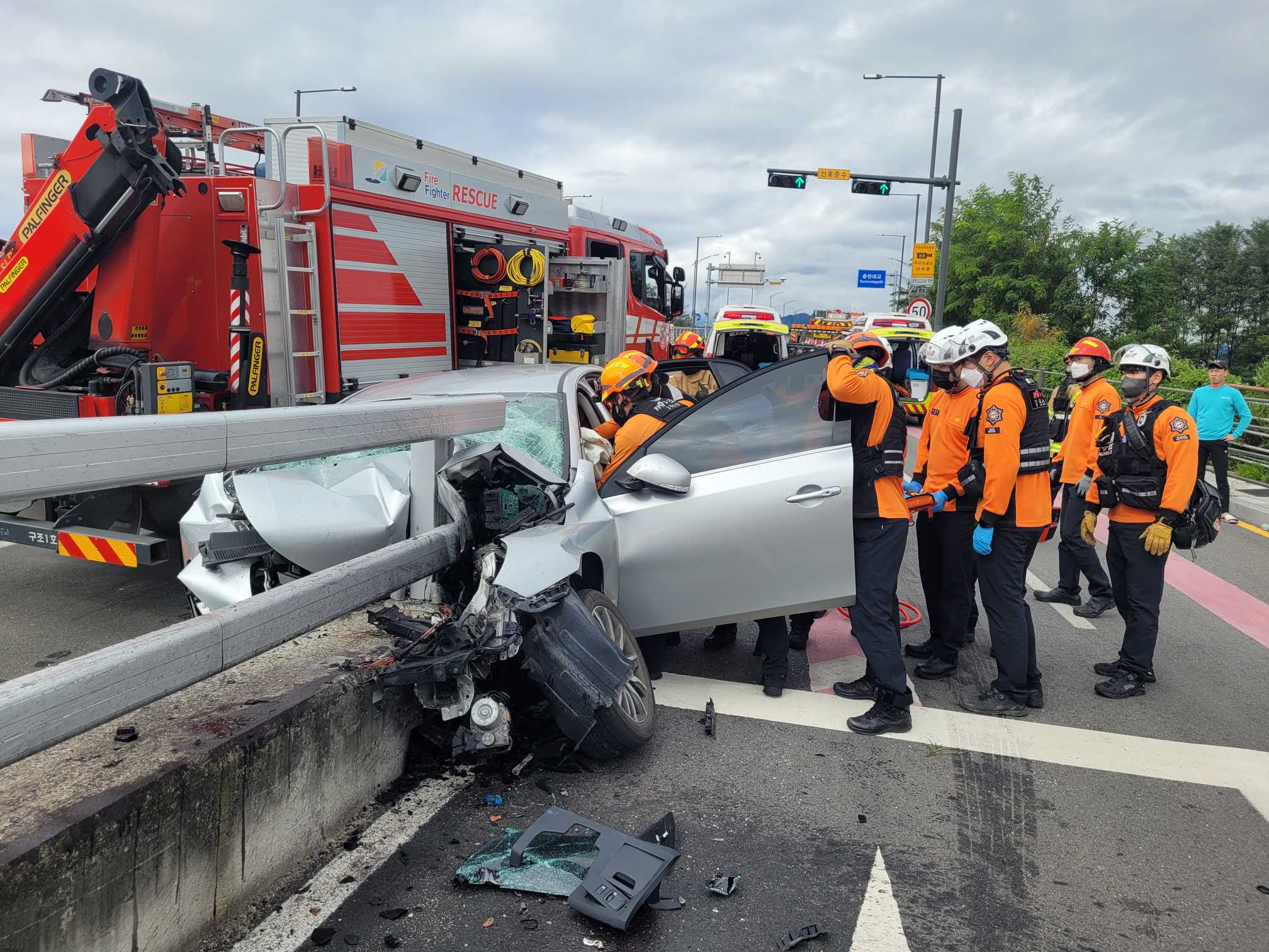 10:01, 승용차 단독사고(가드레일 충돌), 중상(남, 59세-다리골절 추정)