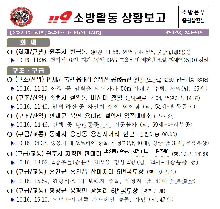119 소방활동 상황보고(10. 16. 일) 17:00