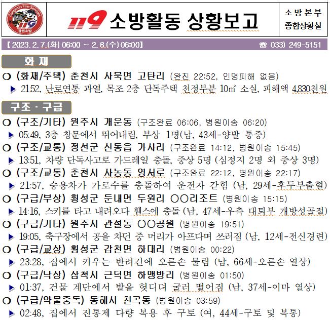 119 소방활동 상황보고(2. 8. 수) 06:00