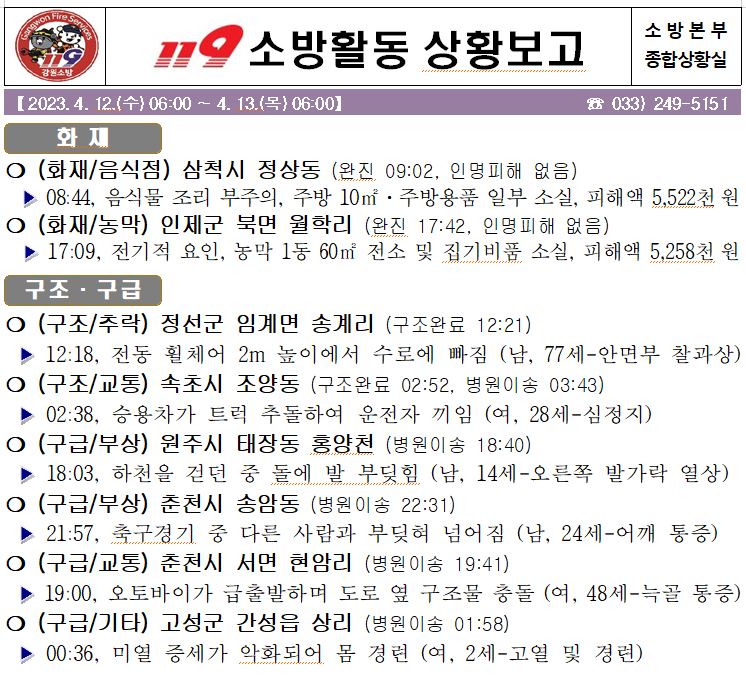 119 소방활동 상황보고(4. 13. 목) 06:00