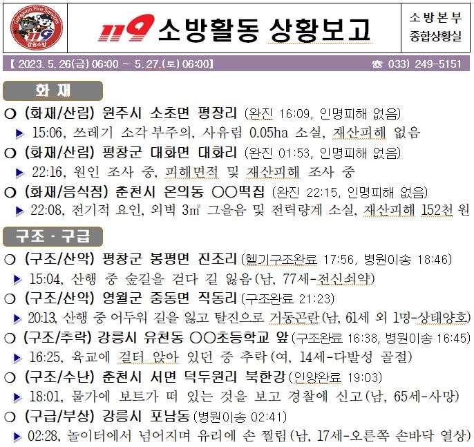119 소방활동 일일상황보고(5.27.토) 06:00